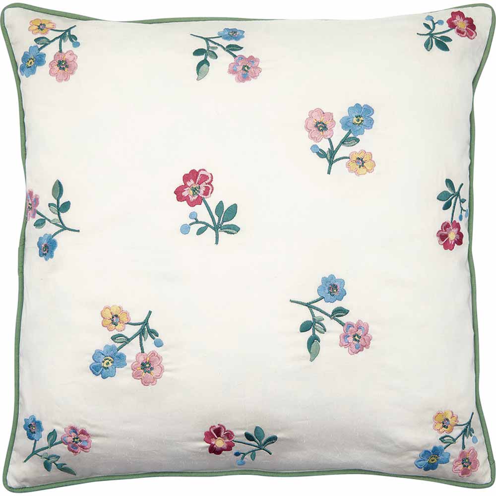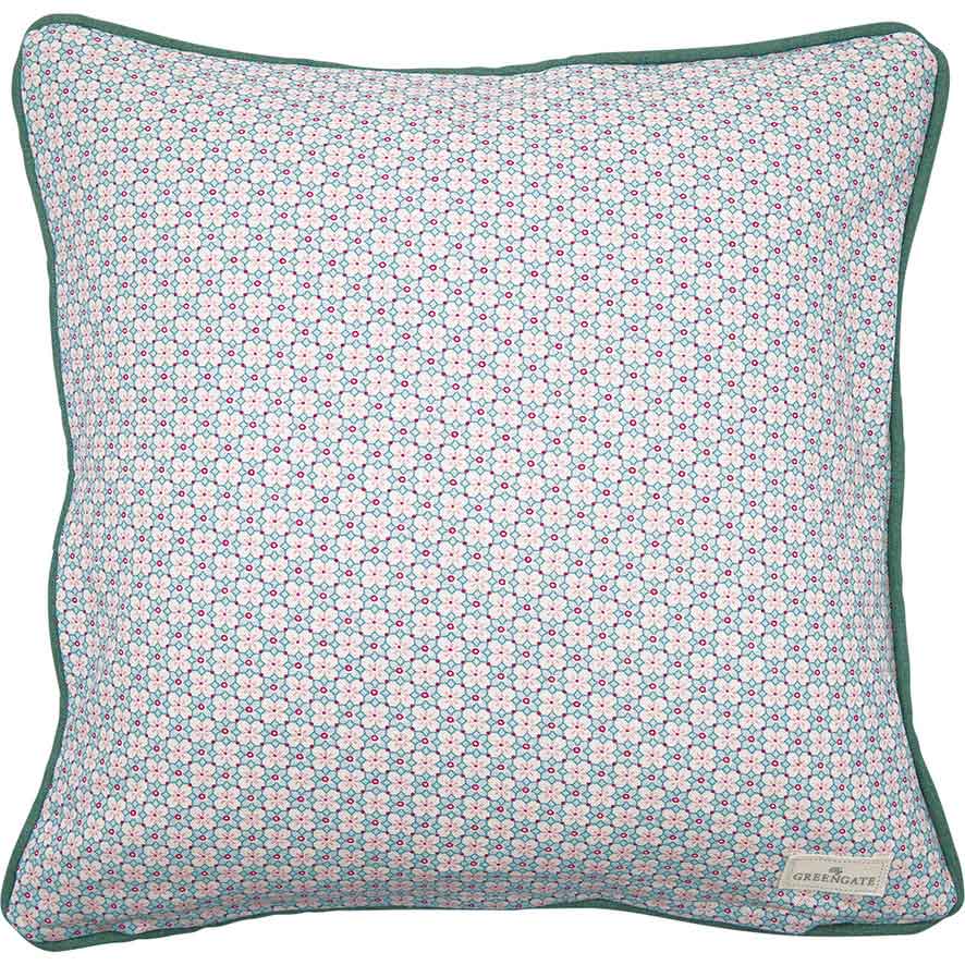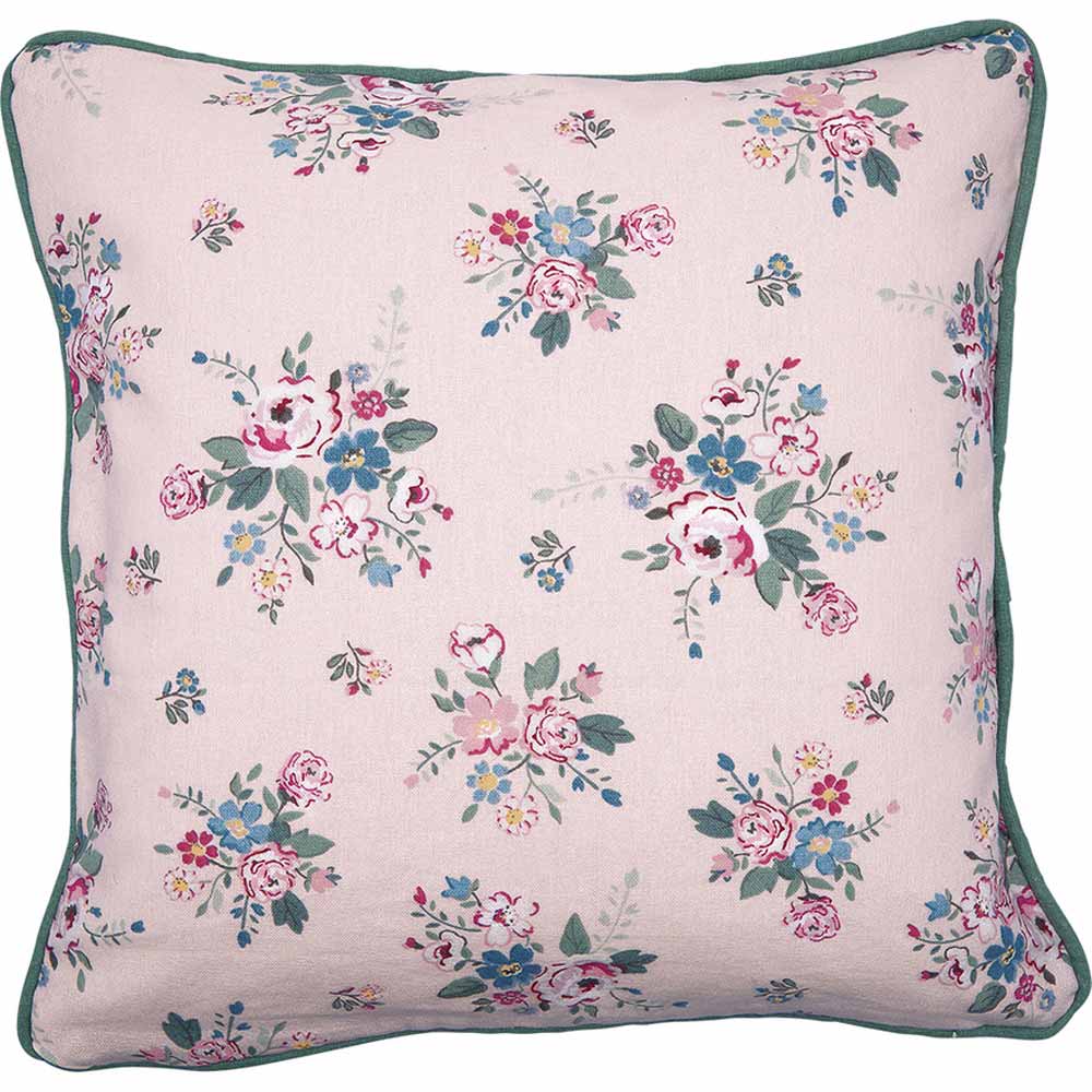 Eine Nahaufnahme des Kissenbezugs von Ib Laursen mit einem hellrosa und beigen Blumenmuster mit blauen Blättern auf Stoff.