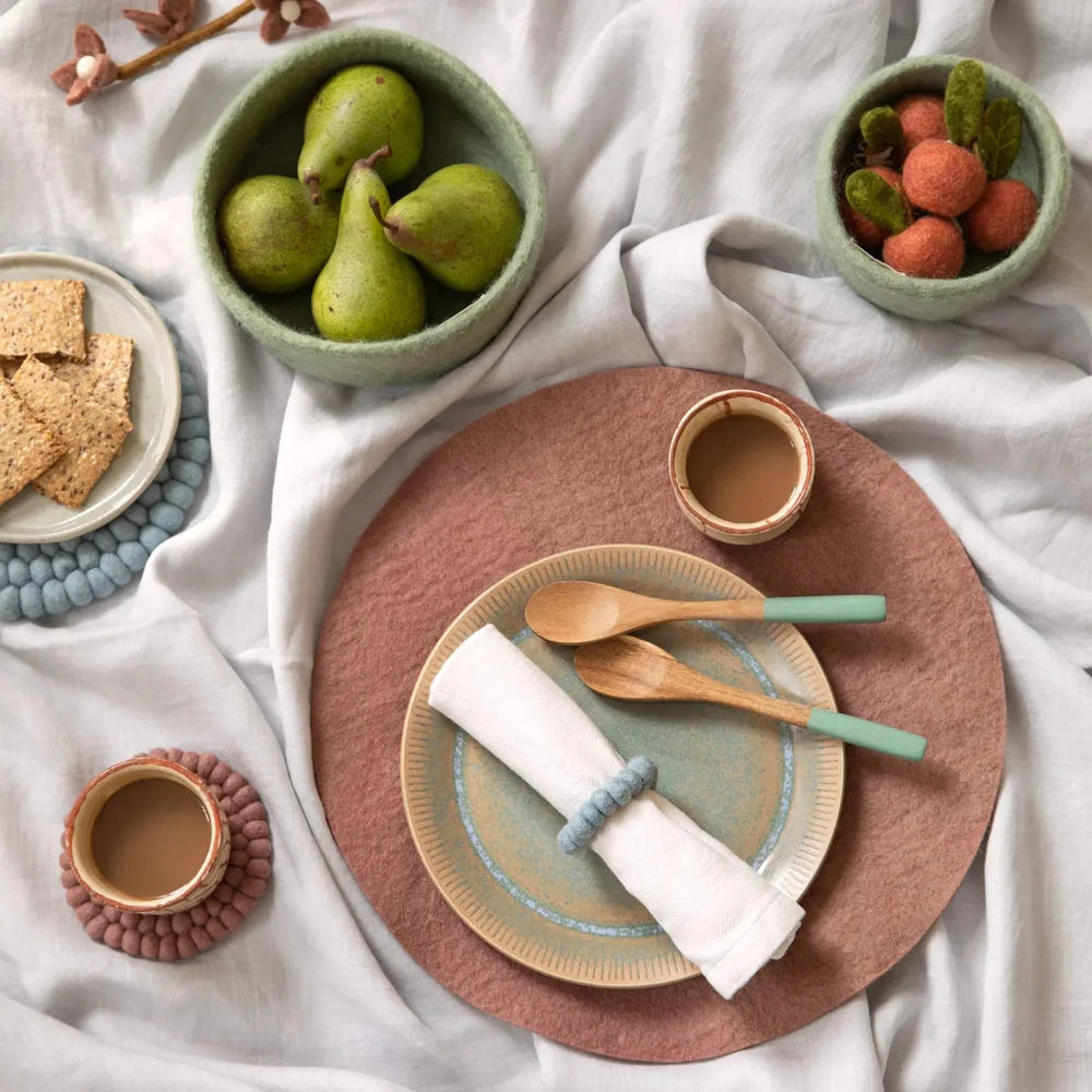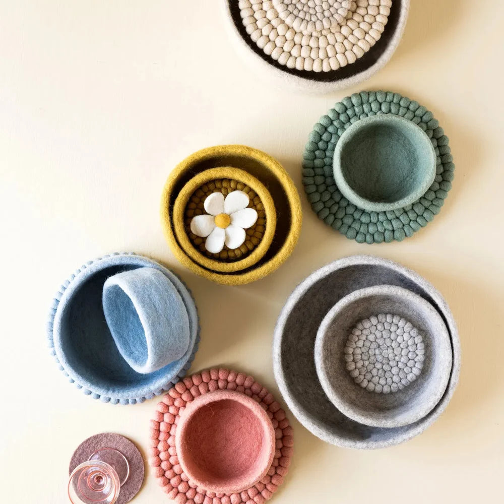Diese drei filigranen Filzschalen in staubigem Hellgrün sind wie eine Brise nordischer Leichtigkeit auf deinem Tisch. Ob als Behälter für Süßigkeiten, Nüsse oder kleine Schätze – ihre organische Form und das warme Filzgefühl verleihen jedem Raum eine hyggelige Note.