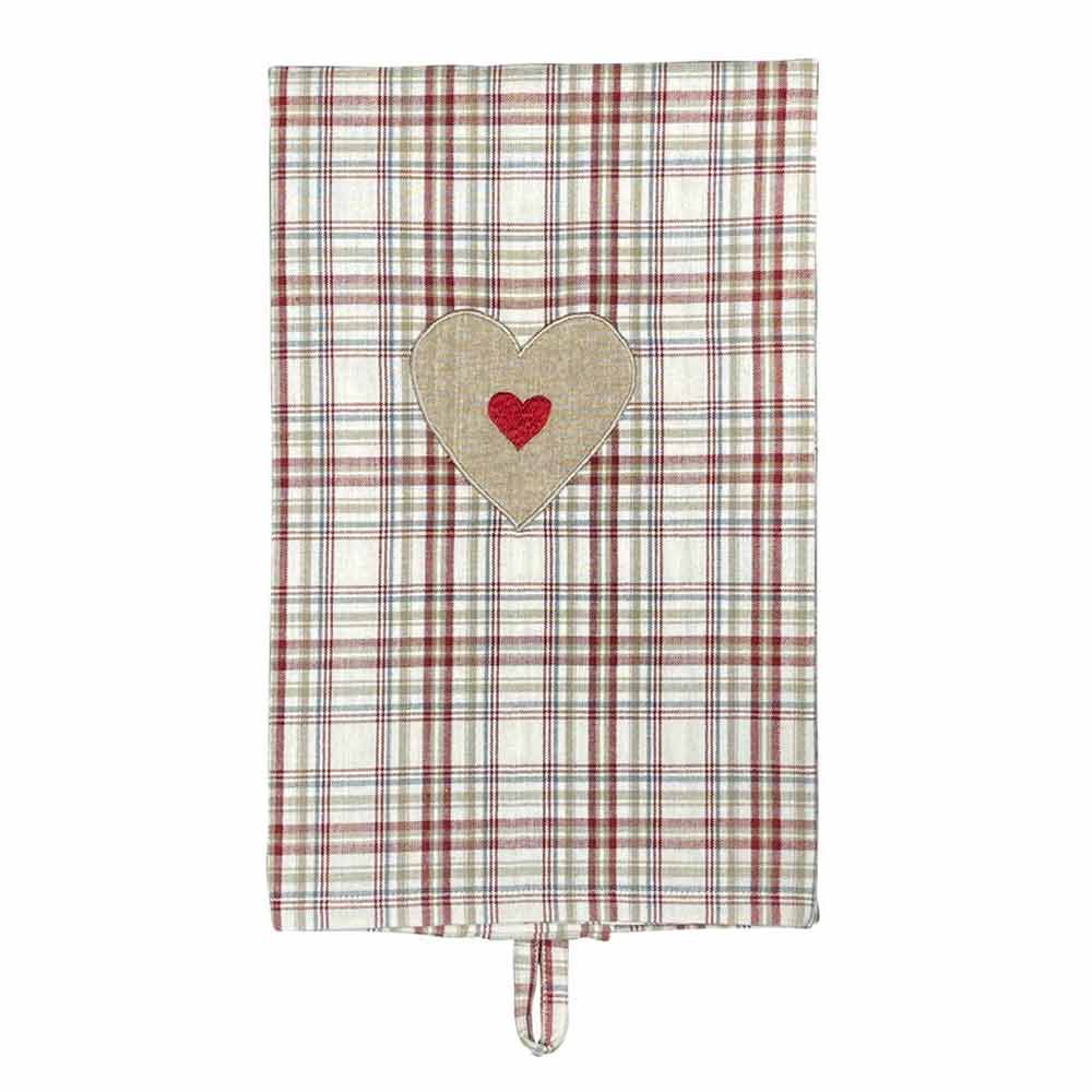 | Design | Kariertes Geschirrtuch mit großer beige-roter Herzapplikation |