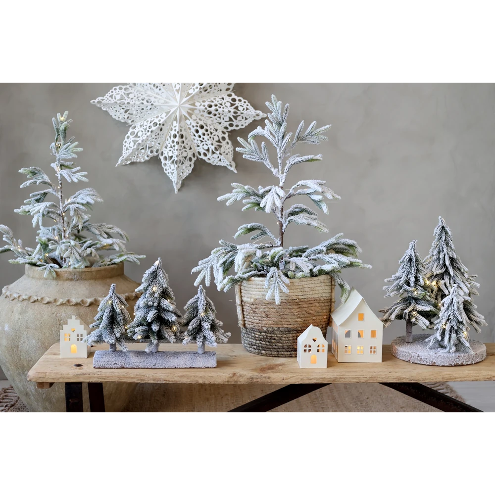 Diese beiden filigranen Kerzenhäuser bringen den Zauber eines winterlichen Dorfes direkt auf deinen Tisch. Die Häuschen bestehen aus cremefarben lackiertem Eisen und sind so gestaltet, dass das warme Licht eines Teelichts durch die ausgeschnittenen Fenster und Herzen flackert. Die sanft gewellten Dächer und unterschiedlichen Fassaden verleihen dem Duo einen charmanten, verspielten Charakter, der hervorragend zu skandinavischen oder französischen Landhausstilen passt.