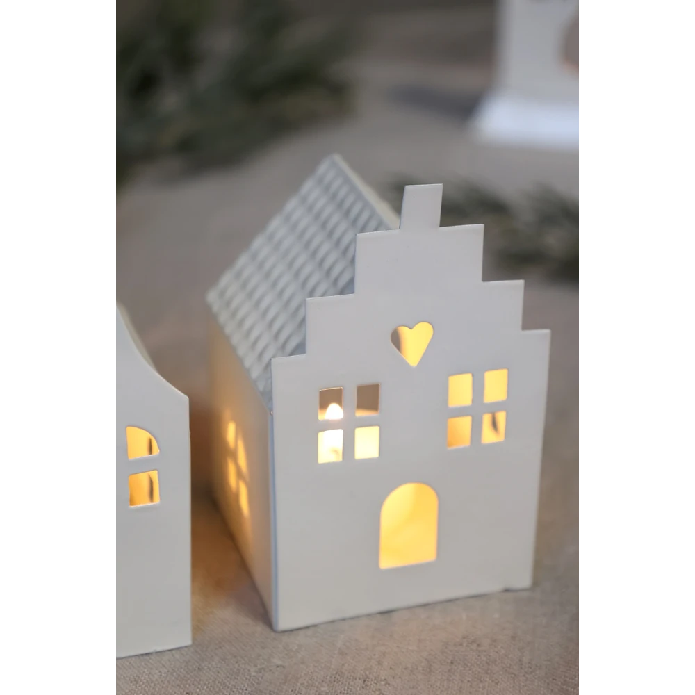 Das Set besteht aus zwei unterschiedlichen Häuschen, jeweils mit liebevoll gestalteten Details: Das eine Haus besitzt ein geschwungenes Giebel‑Dach mit herzförmigen Fenstern, während das andere einen klassischen Satteldach‑Look mit quadratischen Fenstern zeigt. Beide sind aus robustem Eisen gefertigt und in einem zarten Creme‑Ton pulverbeschichtet. Durch die Öffnung an der Rückseite lassen sich Teelichter einfach einsetzen, und die kleinen Lichthäuser werfen stimmungsvolle Schatten – ideal für festliche Abende.