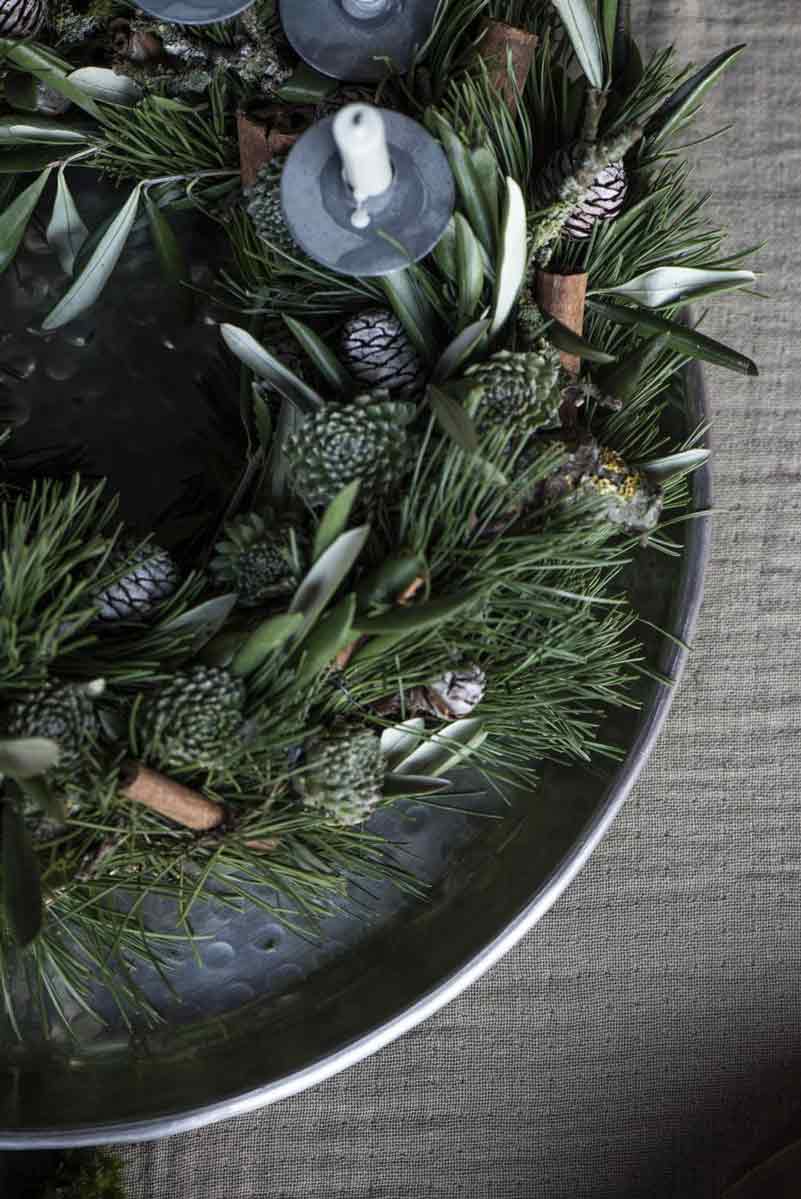 Adventskranz Mit Tannenzweigen, Kerzen und weiterem Dekomaterial einen Kranz binden.