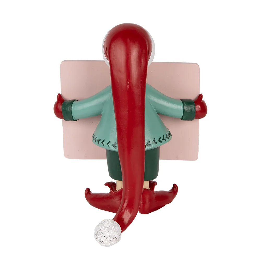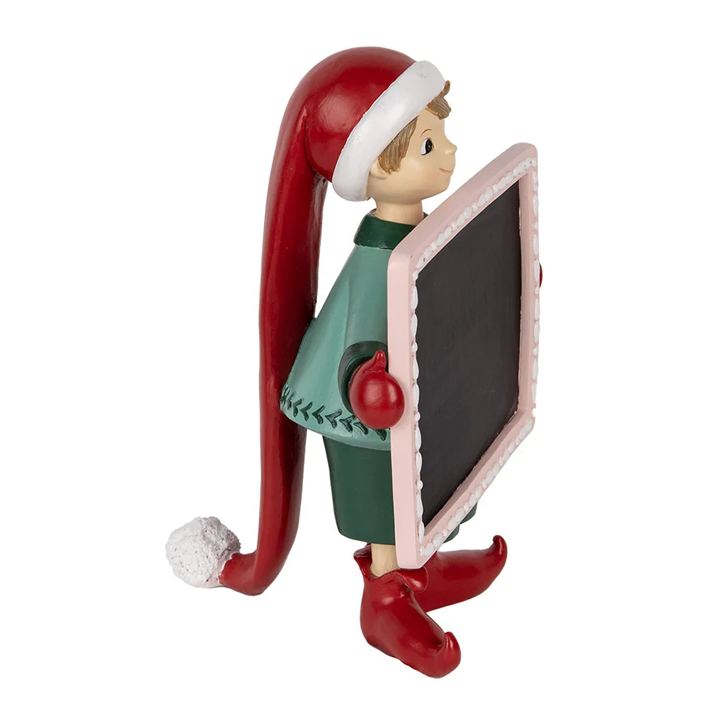 Die Figur besteht aus robustem Kunststoff und ist detailreich bemalt. Die Kreidetafel lässt sich immer wieder beschriften – für Menüpläne, Grüße oder kleine Erinnerungen. Mit einer Größe von 18 × 15 × 23 cm passt der Elf wunderbar auf die Kommode, den Schreibtisch oder in die Küche.
