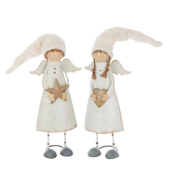 Die mittelgroßen Engel aus Metall vereinen feine Linienführung mit einer gebrochen weißen Patina. Mit einer Höhe von 42 cm wirken sie präsent, ohne die Dekoration zu dominieren. Herz- und Sternattribute verleihen den beiden Varianten eine liebevolle Ausstrahlung, die dein Zuhause in der Adventszeit veredelt.