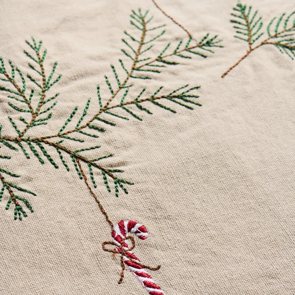 Was es besonders macht- Hochwertiger Stoff in Leinenoptik mit gestickten Tannenzweigen und kleinen Weihnachtsmotiven.