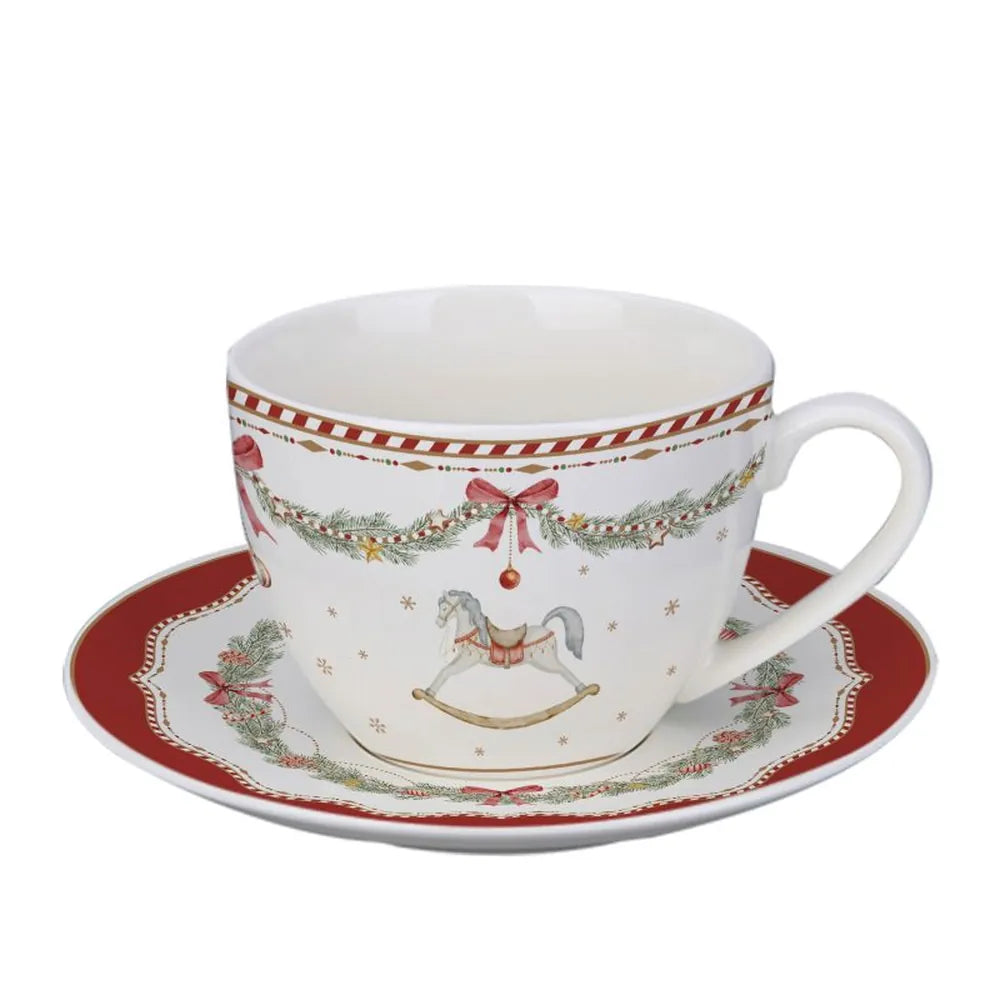 Diese Tasse mit Untertasse ist wie eine herzliche Einladung zum Winter-Plausch. Rote Borden, Zuckerstangenstreifen und eine Tannengirlande mit Schleifen schmücken das Porzellan, während ein zartes Schaukelpferd und goldene Sternchen nostalgische Gefühle wecken. Perfekt für deinen Tee oder Cappuccino an kalten Tagen.