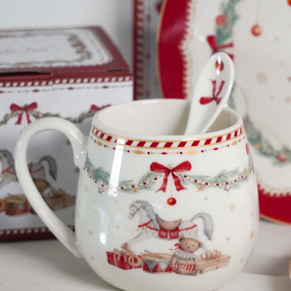 Der bauchige Happy‑Holidays‑Becher ist gemacht für lange Winterabende. Die runde Form liegt gemütlich in der Hand, der rote Rand mit Zuckerstangenmuster und die Tannengirlande ziehen sich elegant um den Becher. Das Motiv aus Schaukelpferd, Teddybär und Geschenken erinnert an Märchen unter dem Weihnachtsbaum.