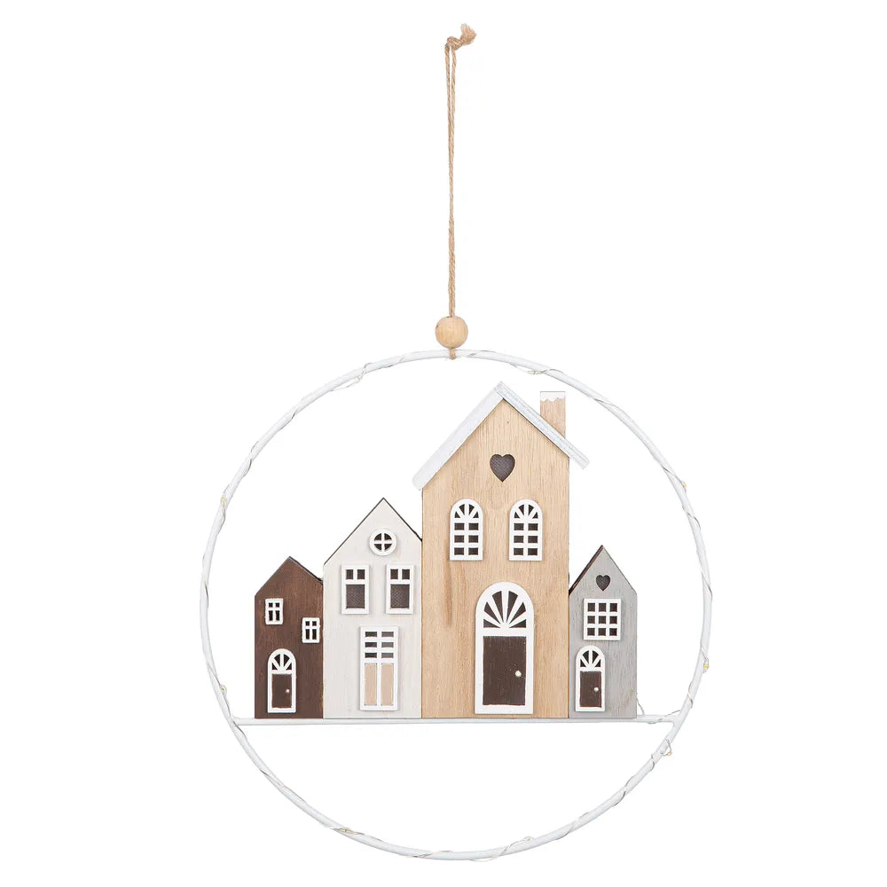 - Runde Hängedeko mit filigranem Häuserensemble im Inneren