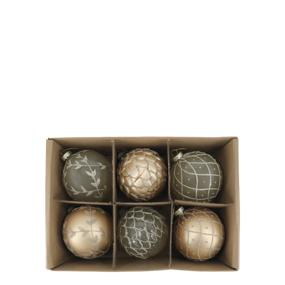 Die sechs Kugeln mit einem Durchmesser von ca. 8 cm werden aus Glas, Eisen und Polyester gefertigt und sorgfältig von Hand verziert. Dadurch gleicht keine Kugel der anderen, jede hat ihren eigenen Charakter. Die matten und glänzenden Oberflächen sowie die glitzernden Linien erzeugen ein spannendes Spiel aus Licht und Struktur. Das Set umfasst sowohl transparente als auch deckende Töne – perfekt, um deinen Baum oder ein Gesteck abwechslungsreich zu dekorieren. Die stabile Box mit Unterteilungen schützt die Kugeln beim Verstauen und erleichtert das Aufbewahren über Jahre hinweg.