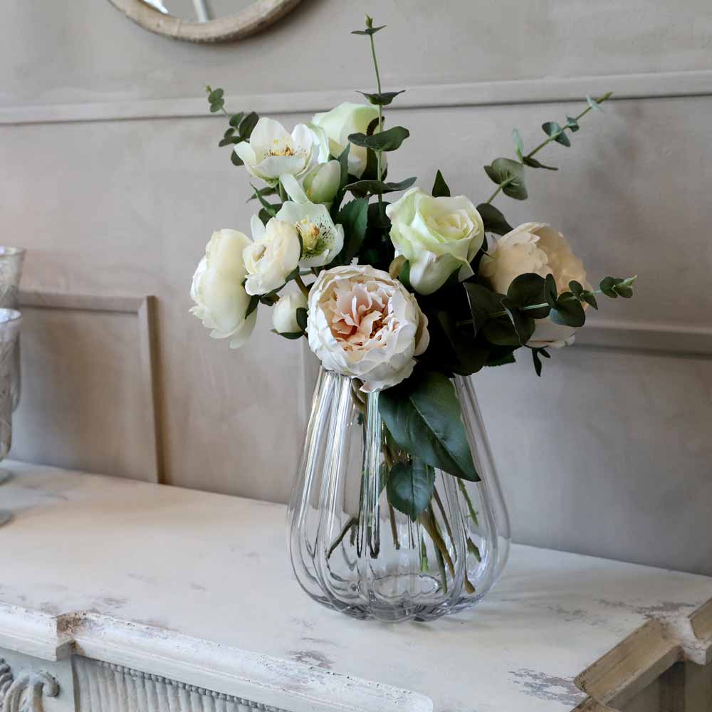 Ob frische Wildblumen oder opulente Bouquets – die klare Vase mit Rillen von Chic Antique lässt jedes Arrangement noch schöner wirken. Dank der sanft geschwungenen Silhouette und dem transparenten Glas zaubert sie nordische Leichtigkeit auf deinen Tisch und bringt deine Lieblingsblumen zum Strahlen. So wird jeder Strauß zum Blickfang und jede Kaffeetafel zur Bühne für florale Kunst.