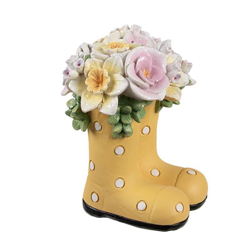Diese verspielte Dekofigur von Clayre & Eef bringt mit ihren sonnengelben Gummistiefeln und den fröhlich blühenden Blumen sofort Frühlingsstimmung in Dein Zuhause. Die liebevollen Details und das farbenfrohe Design machen sie zum echten Hingucker – perfekt für alle, die das Leben, Blumen und kleine, charmante Highlights lieben.
