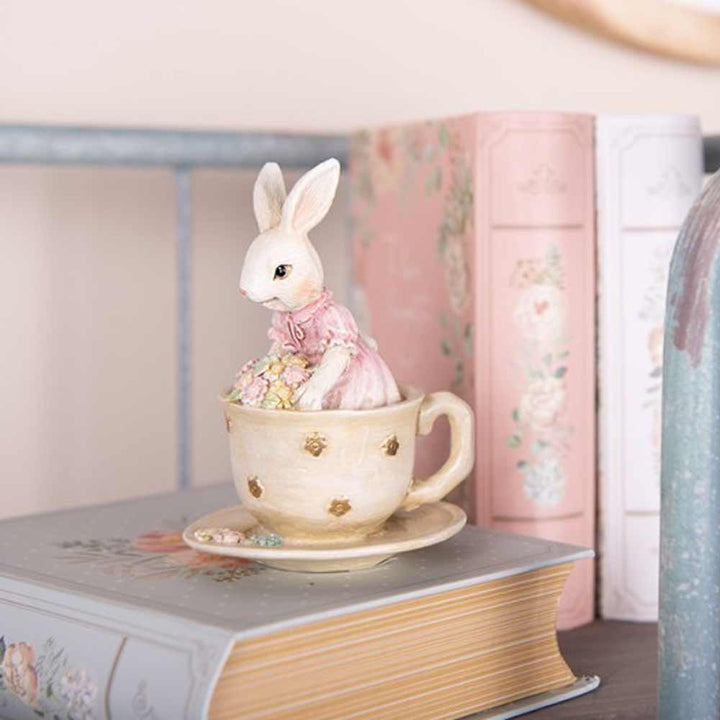 Das Häschen trägt ein rosafarbenes Kleid mit Schleife und Rüschen, hält einen pastelligen Blumenstrauß in den Pfoten und sitzt in einer elegant verzierten cremefarbenen Tasse mit goldenen Akzenten. Die feine Handbemalung und der Vintage-Shabby-Chic-Stil machen jede Figur zu einem kleinen Kunstwerk. Du kannst ihn übrigens wunderbar mit anderen Häschen aus der Serie kombinieren!