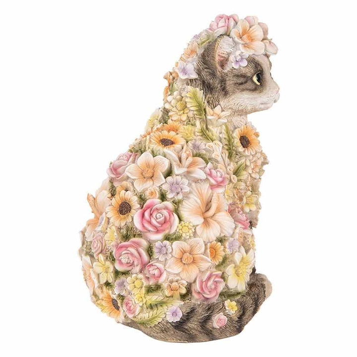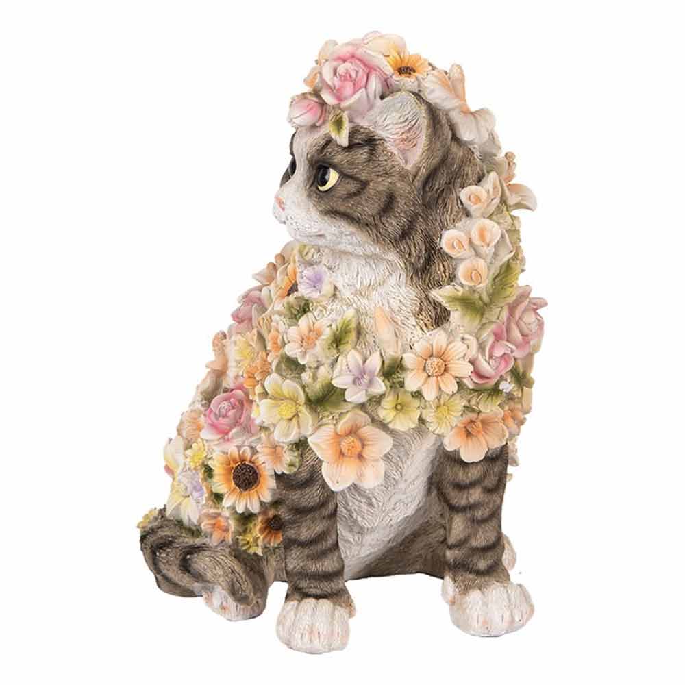 Die sitzende Katzenfigur beeindruckt mit einem ausdrucksstarken, lebendigen Blick, naturgetreuen Details an Gesicht und Pfoten sowie einem farbenfrohen Blütenkleid aus Rosen, Lilien, Margeriten und Sonnenblumen. Zarte Pastelltönewie Rosa, Apricot, Flieder und Gelb kombiniert mit frischem Grün machen sie zu einem echten Kunstwerk – romantisch, verspielt und einzigartig.
