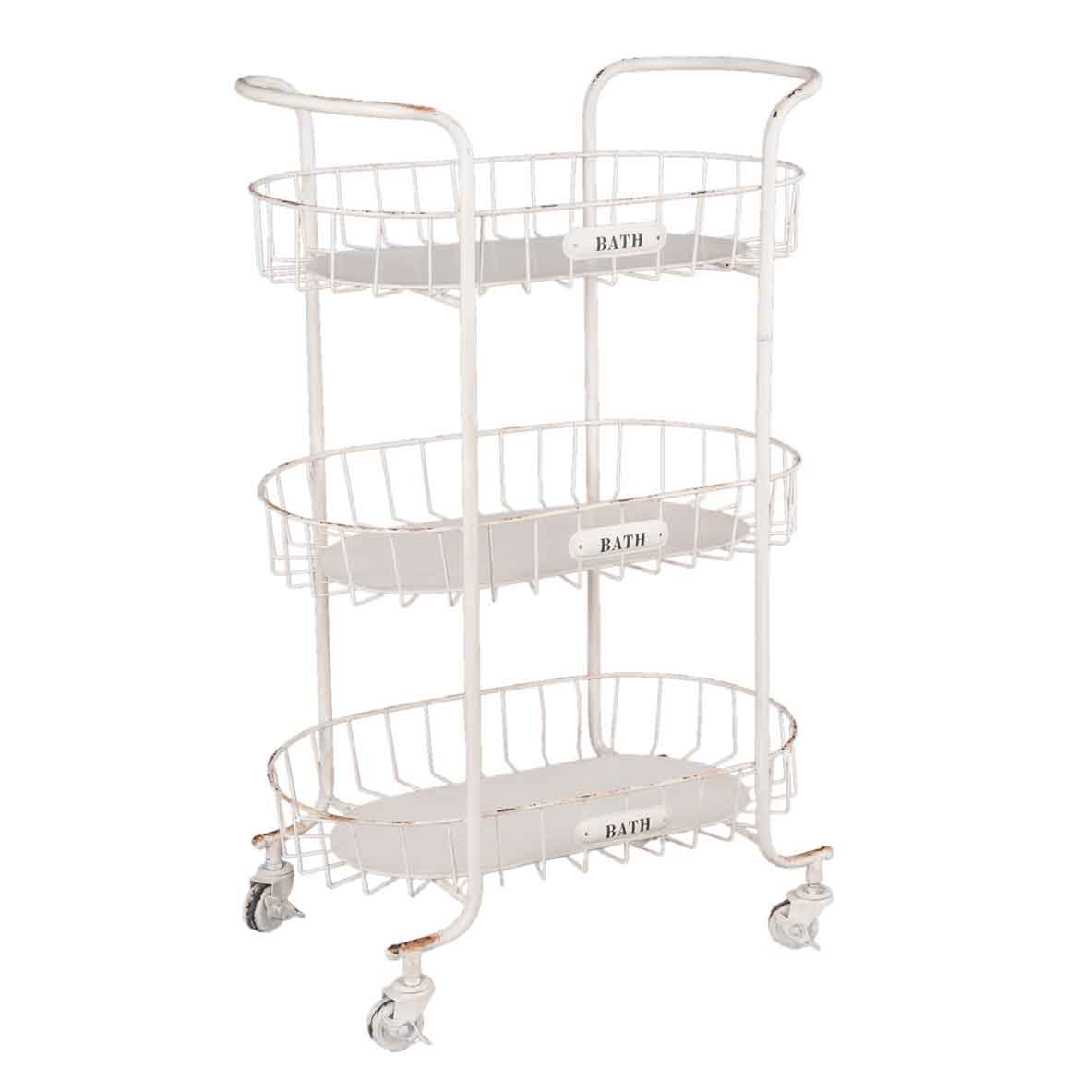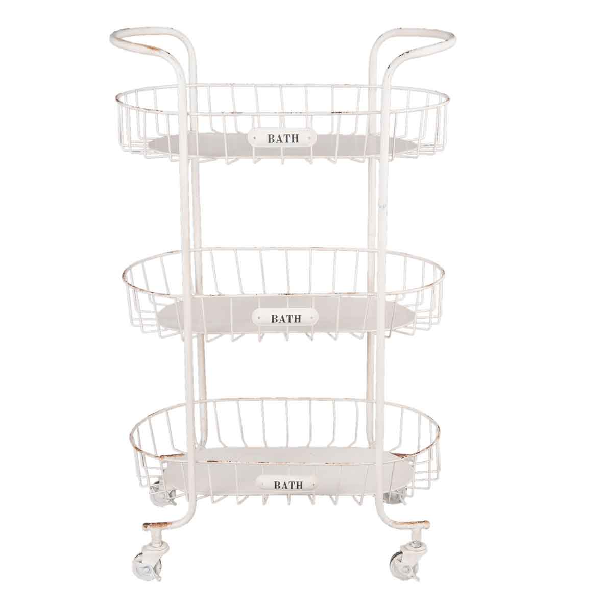 Dieses charmante Eisenregal auf Rollen bringt Ordnung und Leichtigkeit ins Badezimmer. Mit drei geräumigen Körben bietet es Platz für Handtücher, Pflegeprodukte oder dekorative Accessoires. Die liebevollen BATH‑Schilder und das geschwungene Gestell in sanftem Creme setzen einen verspielten Akzent und machen das Regal zum Blickfang.
