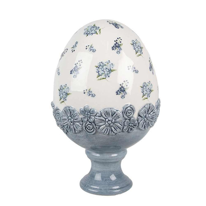 Das Ei begeistert durch eine einzigartige Kombination aus Glanz und matter Eleganz. Der obere Teil glänzt in edlem Cremeweiß mit einem feinen Blumenmuster in Hydrangea-Optik, während der Sockel in einem stilvollen Blaugrau mit plastischer Blumenbordüre gehalten ist. Diese detailreiche Gestaltung verleiht dem Stück seinen besonderen Charme – perfekt für Fans des Landhausstils oder Shabby Chic!