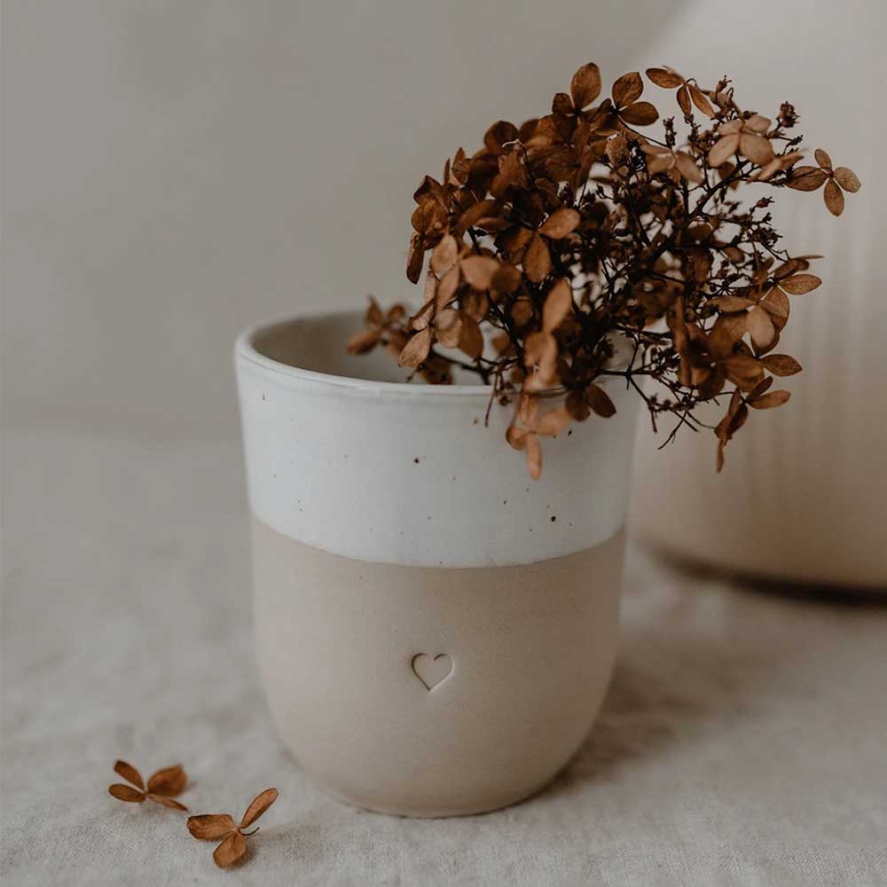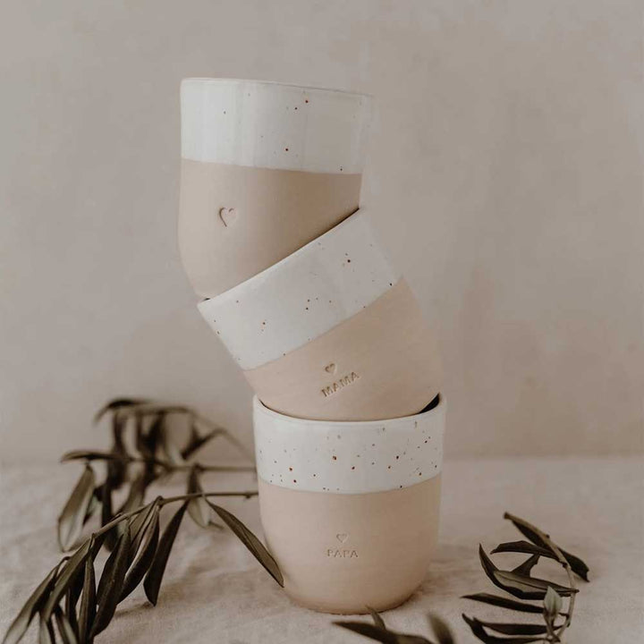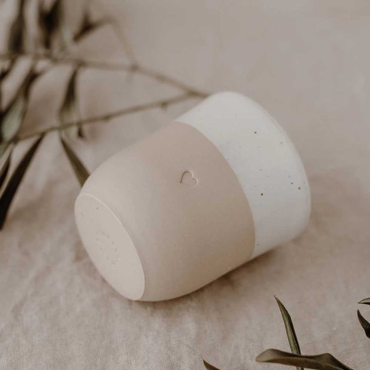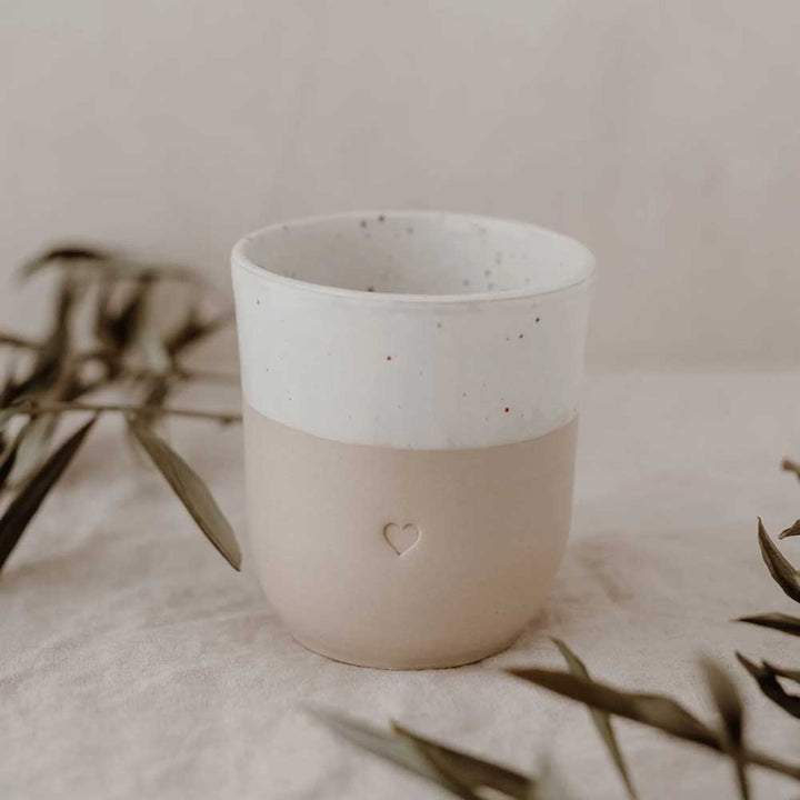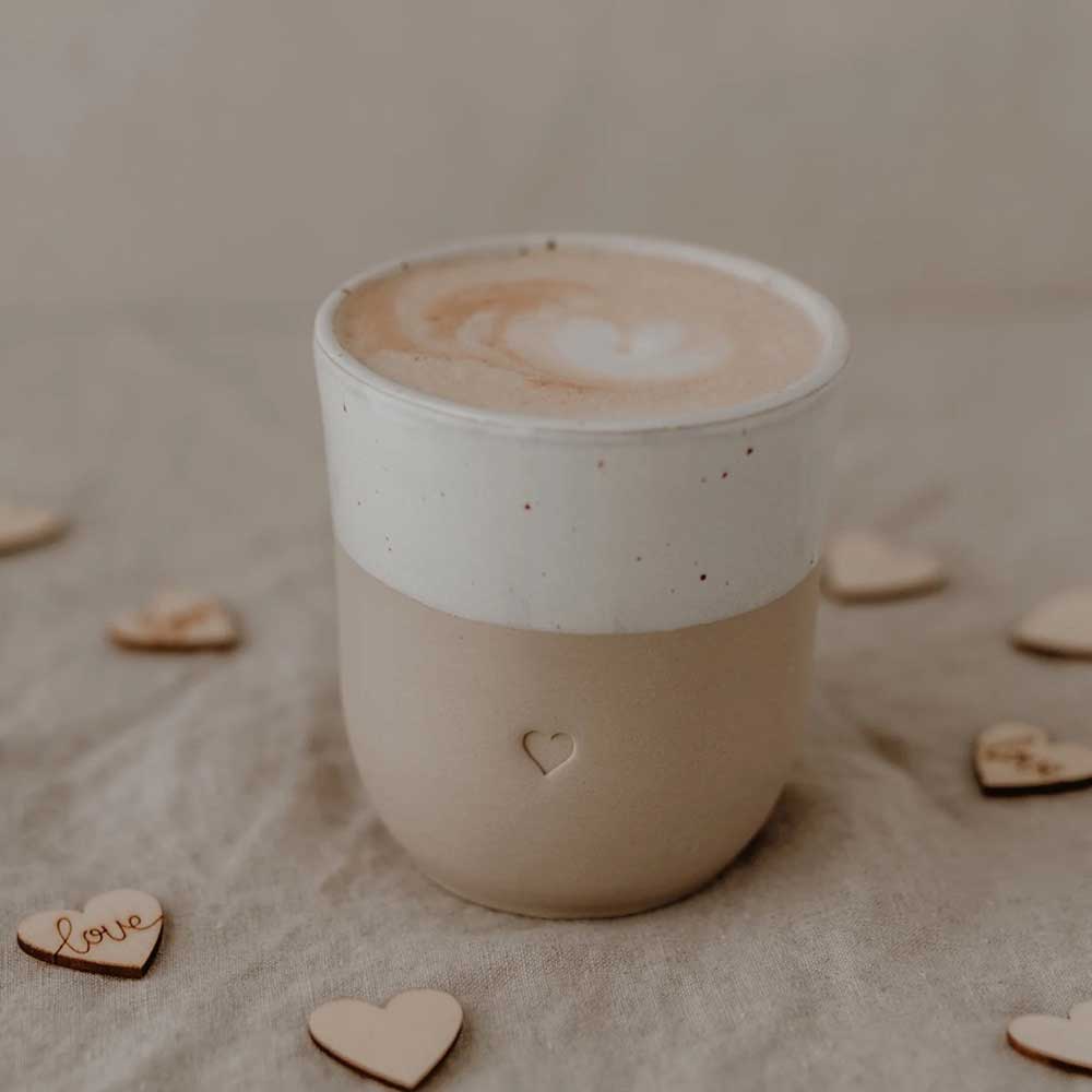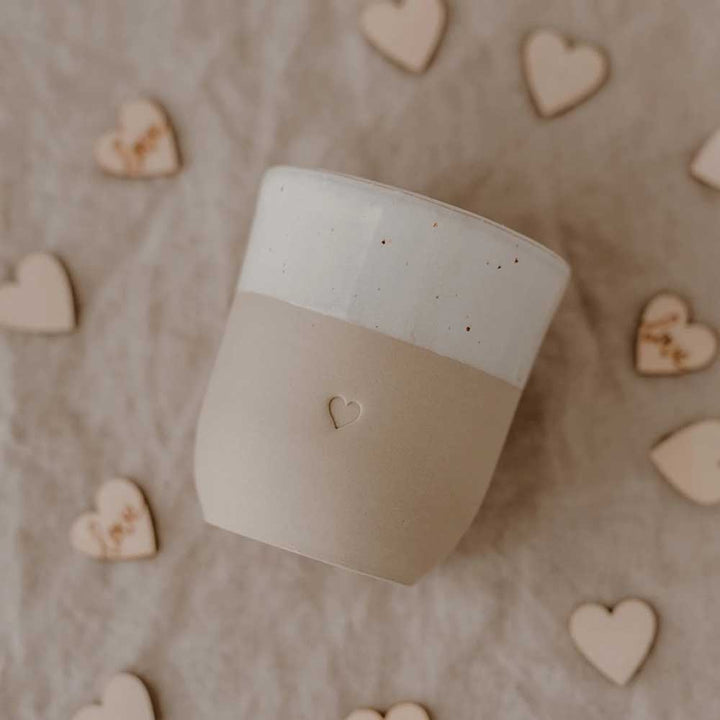 Jeder Becher ist handgefertigt in einer kleinen portugiesischen Töpferei – und das sieht man! Die Kombination aus matter, sandfarbener Unterhälfte und cremeweißer, gesprenkelter Glasur oben verleiht ihm einen natürlichen Handmade-Charakter. Die dezente Herzprägung macht ihn minimalistisch und romantisch zugleich – ein echtes Lieblingsstück mit Seele.