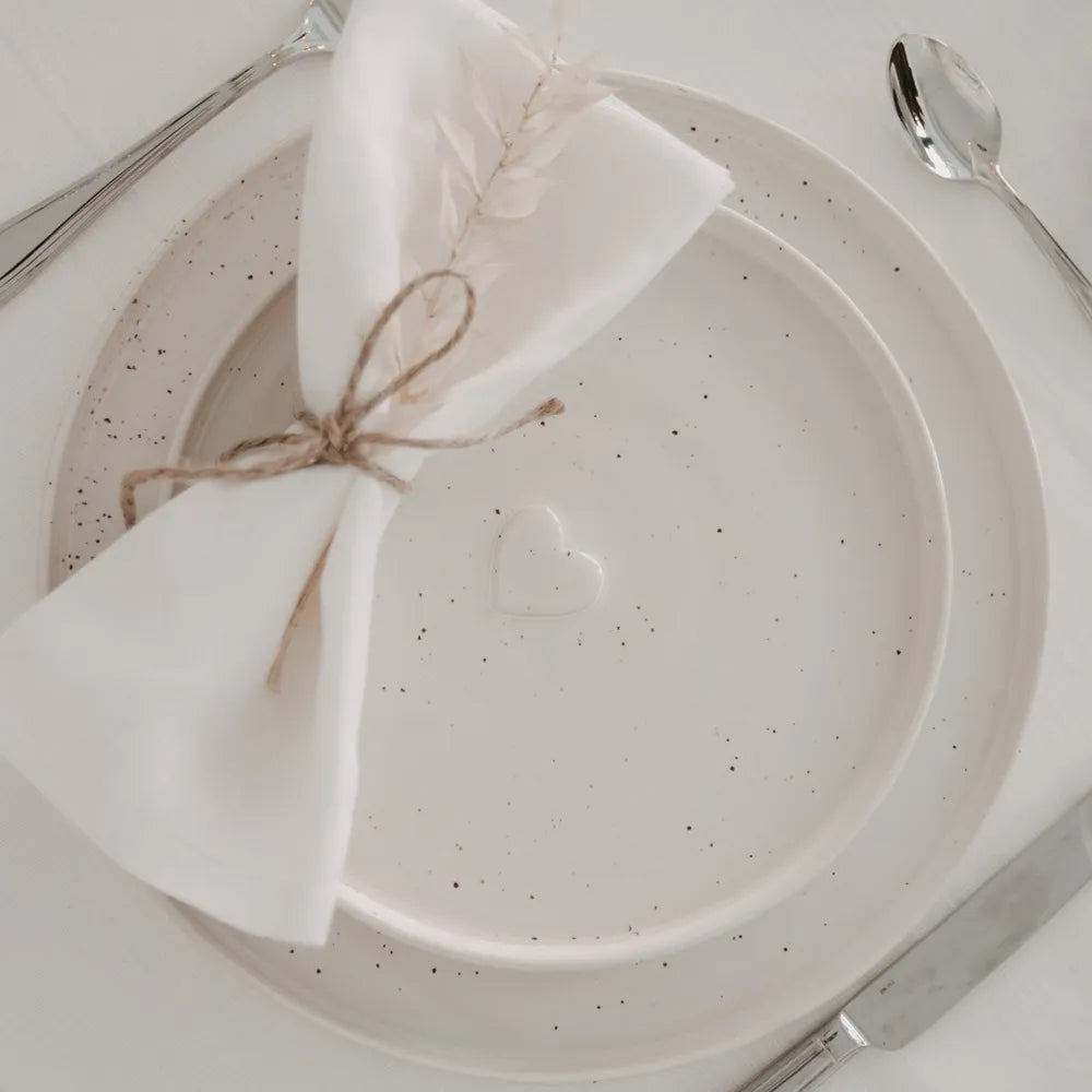 Kombiniere die Teller mit groben Leinen-Servietten und goldenem Besteck, um das kleine Herz in der Mitte so richtig strahlen zu lassen ♥.