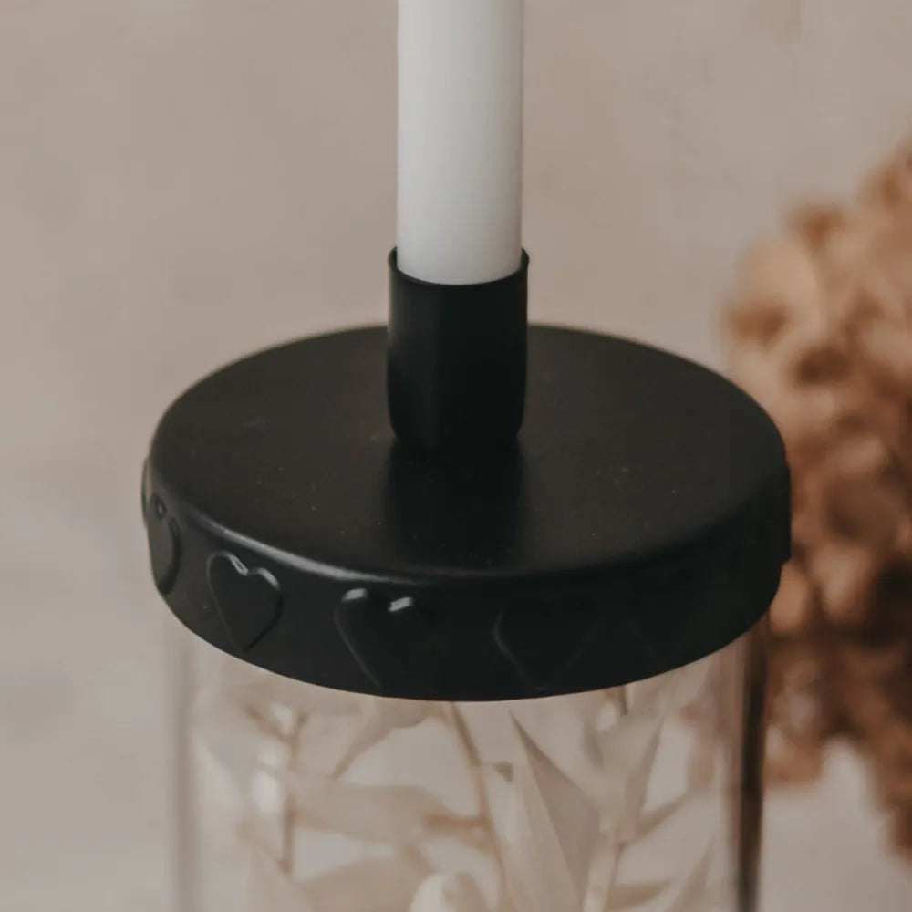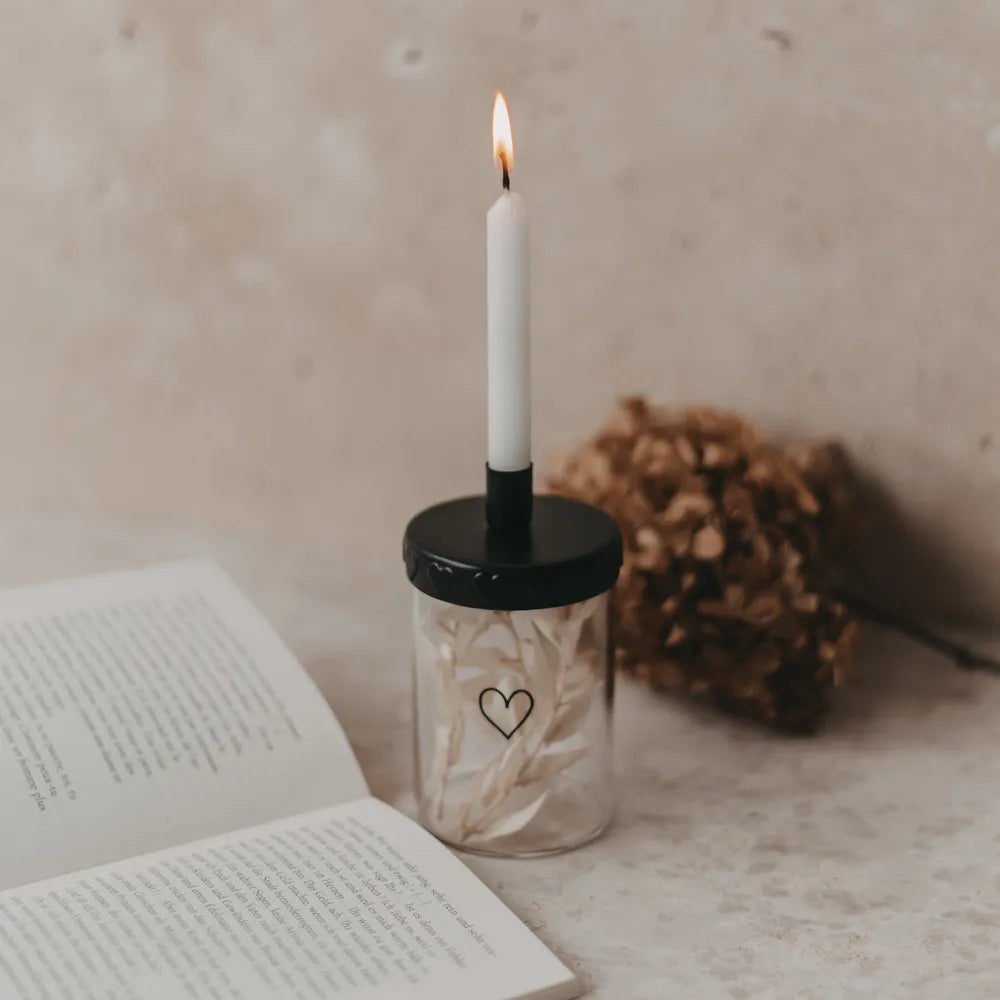 Mach es dir gemütlich und bringe nordische Leichtigkeit in dein Zuhause! Dieser zauberhafte Kerzenhalter Mini Herzen von Eulenschnitt verwandelt schlichte Mini-Vorratsgläser im Handumdrehen in romantische Lichtquellen. Das edle Design in mattem Schwarz fügt sich wunderbar in jeden Wohnstil ein und sorgt für hyggelige Stimmung ♥.