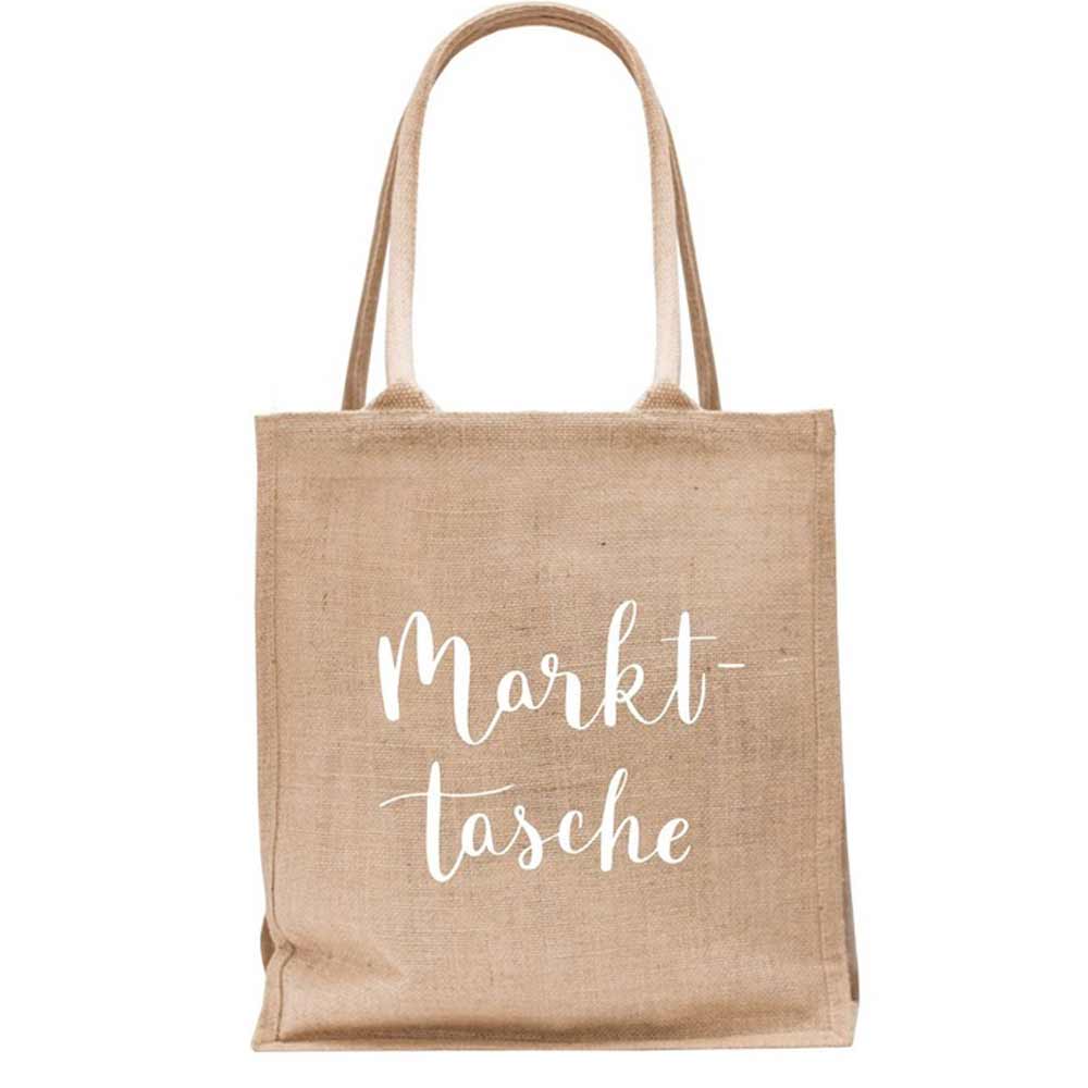 | Design | naturbelassene Farbe mit weißem Schriftzug „Markt tasche“, lange Tragehenkel |