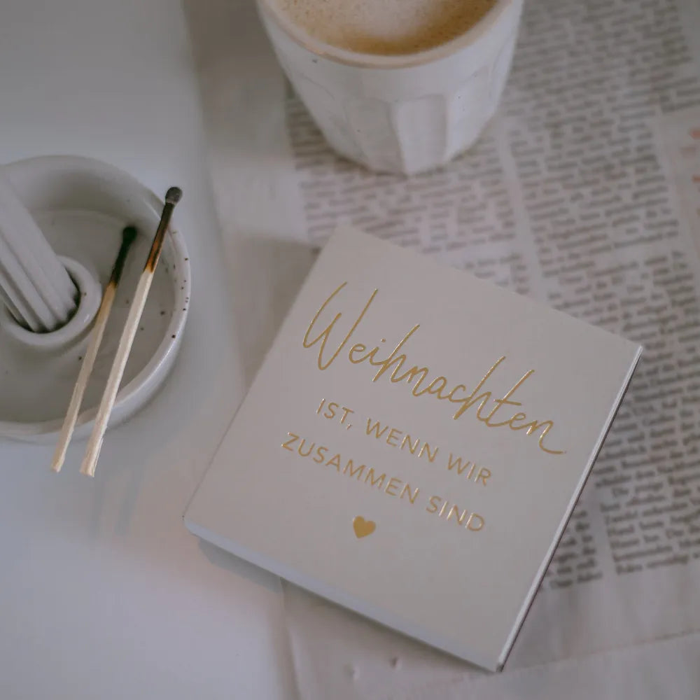 Bring festlichen Glanz in dein Zuhause mit diesen wundervollen Streichhölzern von Eulenschnitt. Die edle Schachtel mit Goldprägung und dem herzerwärmenden Spruch "Weihnachten ist, wenn wir zusammen sind" macht schon das Anzünden der Kerzen zum kleinen Highlight. Ob für den Adventskranz oder als liebevolles Mitbringsel – diese langen Hölzer sorgen für gemütliche Hygge-Momente ♥.