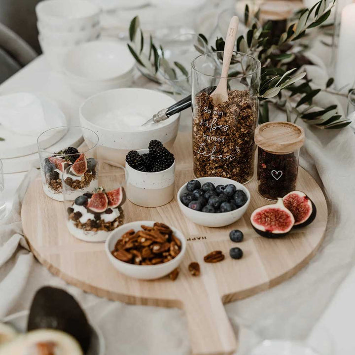 Fülle das Glas mit bunten Bonbons, selbstgebackenen Keksen oder saisonalen Leckereien – und stelle es gut sichtbar auf dein Küchenregal oder den Frühstückstisch. Besonders schön: Kombiniere mehrere Vorratsgläser nebeneinander – das ergibt ein harmonisches, skandinavisch angehauchtes Gesamtbild.