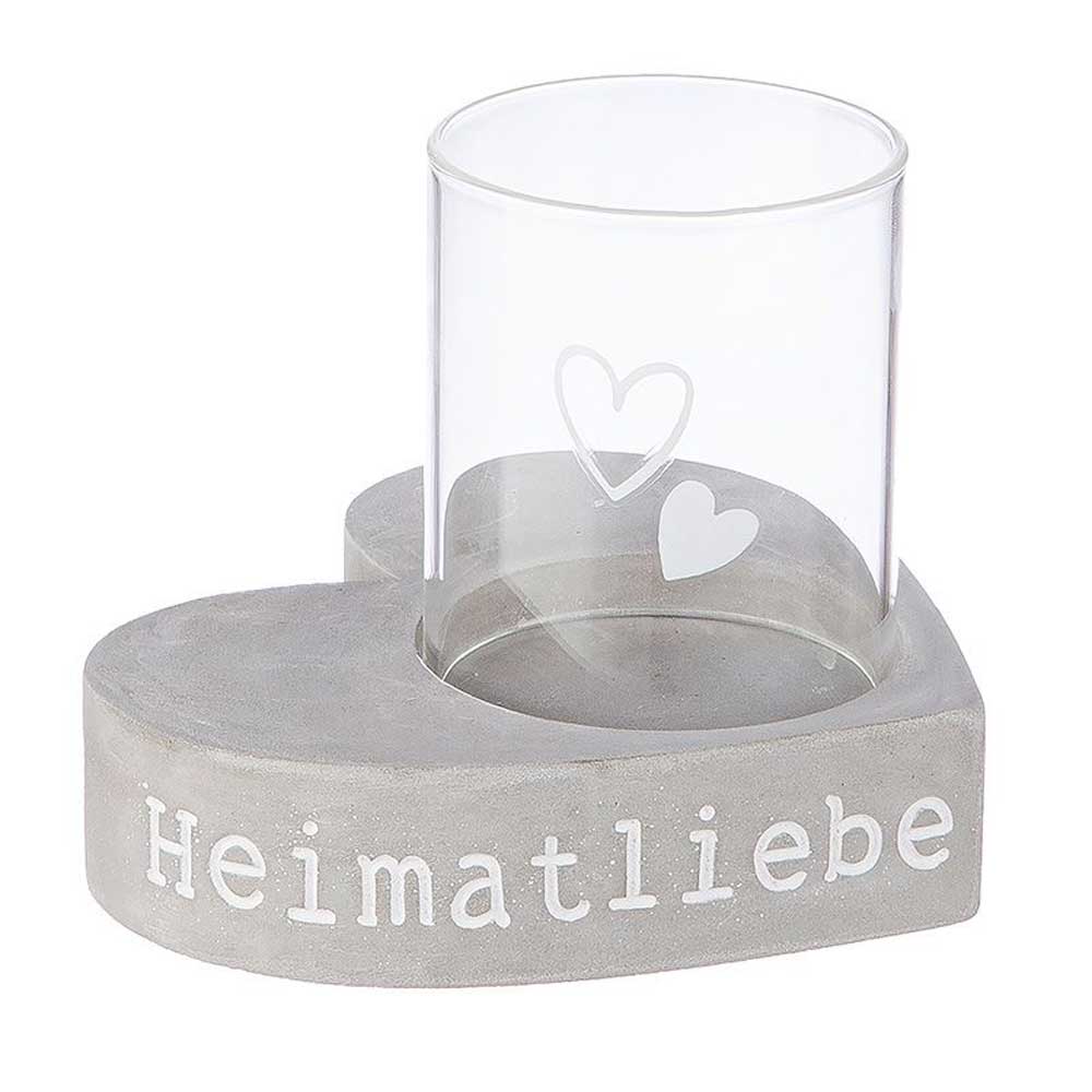 Dieses herzförmige Windlicht vereint rustikalen Charme mit modernem Design. Der Betonsockel mit dem Schriftzug „Heimatliebe“ und das filigran verzierte Glas schaffen eine warme, heimelige Atmosphäre – perfekt für dein Zuhause!