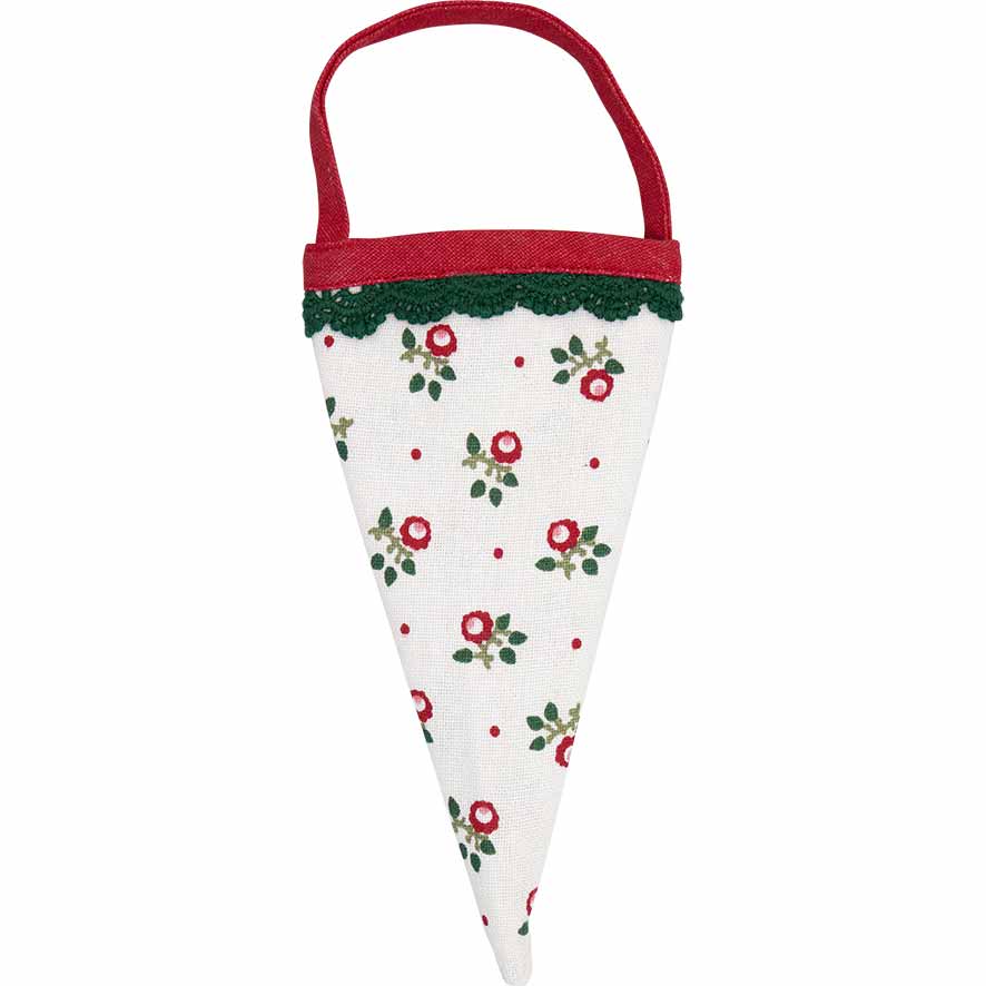 Das liebevoll gestaltete Accessoire stammt aus der GreenGate Serie Abi petit. Die Kombination aus cremefarbenem Grund, zarten Rosenknospen und satten Farbakzenten wirkt klassisch und doch frisch. Durch den Henkel lässt sich die Spitztüte überall aufhängen, ob am Türgriff, an einem Zweig oder am Weihnachtsbaum. Sie ist wiederverwendbar und eignet sich ideal, um kleine Aufmerksamkeiten oder Süßigkeiten stilvoll zu verschenken.