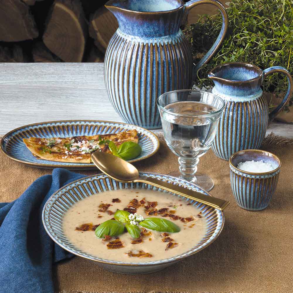 Was sofort ins Auge fällt, ist der breite Rand mit vertikalen Rillen und einem feinen Perlenmuster – verspielt, aber dennoch elegant. Die Kombination aus robuster Steingut-Keramik, glänzender Glasur und stilvoller Farbgebung macht ihn zu einem langlebigen Liebling im Geschirrschrank. Praktisch: mikrowellen- und spülmaschinengeeignet!
