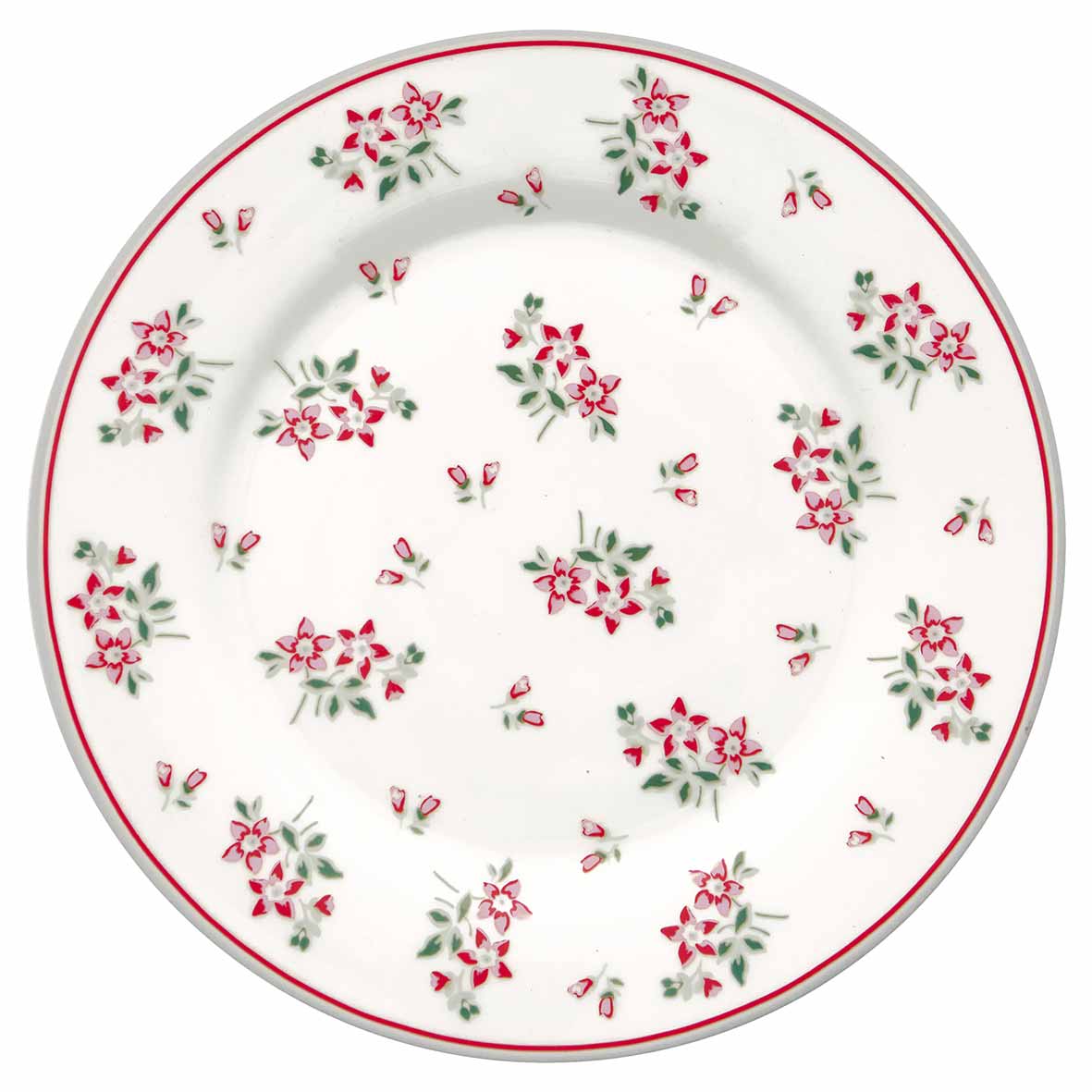 Hergestellt aus langlebigem Porzellan ist der Teller 20,5 cm im Durchmesser. Das Streublümchenmuster ist sorgfältig gedruckt und glasiert, wodurch der Teller spülmaschinen- und mikrowellengeeignet bleibt. Er verbindet spielerische Leichtigkeit mit hoher Qualität.