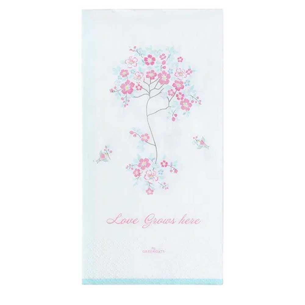 Der weiße Hintergrund lässt das filigrane Motiv besonders edel wirken: Ein wunderschöner Blütenbaum mit rosa Blüten, zarte Äste und drei pastellfarbene Vögel schaffen eine verträumte Szenerie. Der Schriftzug "Love Grows Here" in geschwungener Schrift verleiht der Serviette eine liebevolle Botschaft. Abgerundet wird das Design durch einen dezenten hellblauen Rand mit Strukturprägung – typisch GreenGate!