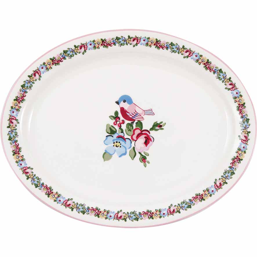 Die ovale Servierplatte hat die perfekte Größe für Fleisch- oder Gemüsespeisen zu servieren. Das zauberhafte Ellie-Design besticht durch zarte Blümchen und Vöglein, die auch Dein Herz dahinschmelzen lassen.