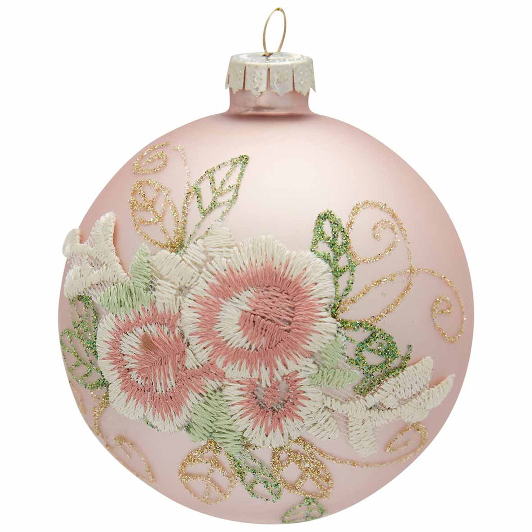 Wie ein zartes Schmuckstück aus Großmutters Schmuckkästchen wirkt diese Weihnachtskugel. Der rosafarbene Untergrund und die filigrane Spitzenapplikation mit Rosen und Blättern versprühen Vintage-Flair. Gold- und Grünglitzer geben dem Ornament einen eleganten Touch.
