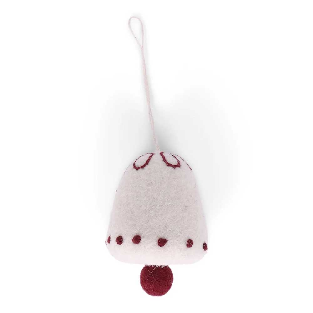 Ein Gry & Sif - Anhänger Glocke Filzornament mit einer roten Schlaufe, roten Punktakzenten an der Unterseite und einem roten Filzklöppel hängt vor einem schlichten weißen Hintergrund.
