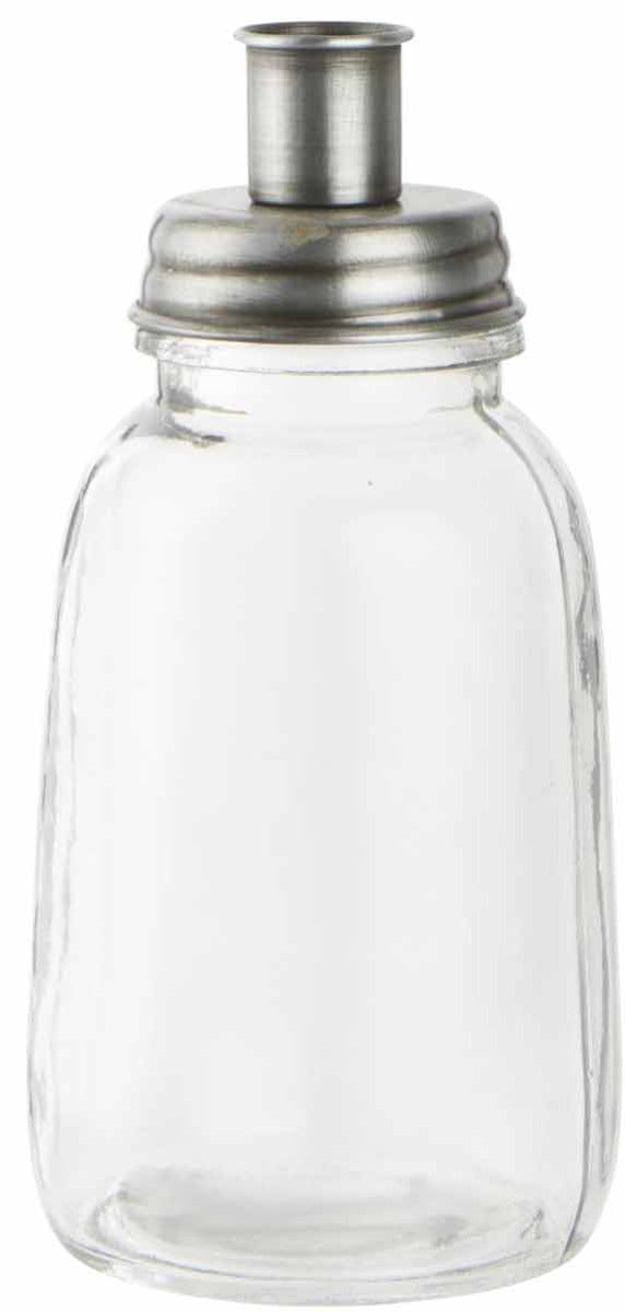 Der Clou dieses Designs ist die Kombination aus robustem Glas und einem länglichen Metalldeckel aus Zink, der eine Stabkerze sicher hält. Mit einer Höhe von rund 17,5 cm und einem Durchmesser von 8,5 cm bietet das Gefäß ausreichend Platz für Wasser, Sand oder kleine Naturmaterialien. Der silberfarbene Deckel verleiht dem schlichten Glas einen Hauch Vintage-Chic und sorgt dafür, dass der Kerzenschein wunderbar reflektiert wird.