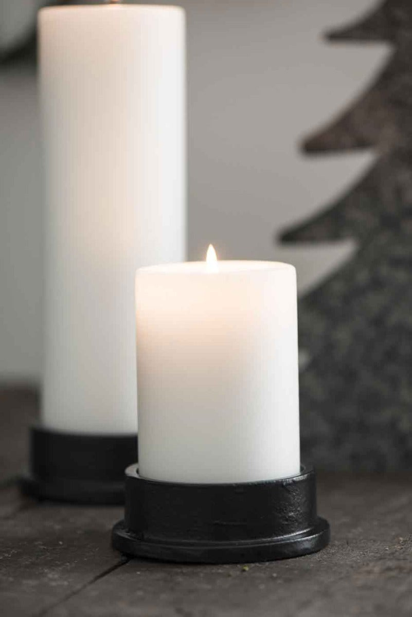 Der Ring ist aus robustem Gusseisen gefertigt und in mattem Schwarz gehalten. Seine klare Form fügt sich sowohl in rustikale Landhaus‑Interieurs als auch in moderne Settings ein. Durchmesser und Höhe sind so gewählt, dass Stumpenkerzen bis ca. 7 cm Durchmesser perfekt hineinpassen und sicher stehen. Ein kleines, aber feines Detail aus der skandinavischen Designwelt.