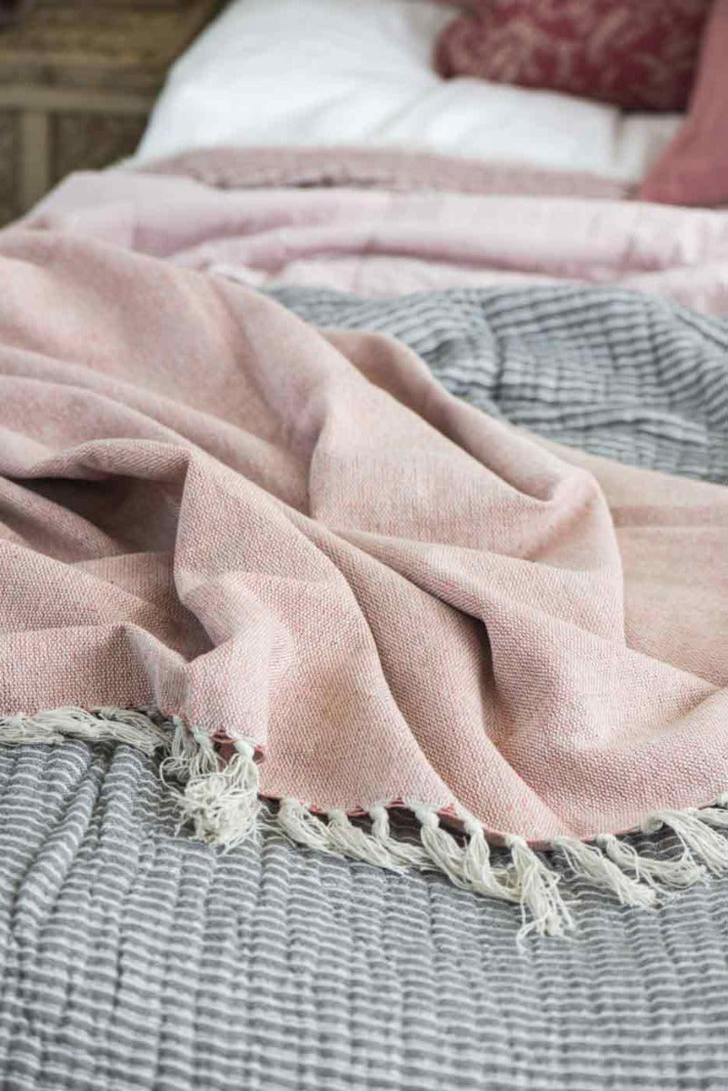 Diese Plaid‑Baumwolldecke in der Farbe Faded Rose lädt zum Kuscheln ein. Mit Maßen von 130 × 160 cm bietet sie ausreichend Platz, um dich auf dem Sofa einzuwickeln oder über einen Sessel zu legen. Der zarte Rosaton erinnert an verblühte Rosen und wirkt beruhigend, während die cremefarbenen Fransen einen verspielten Abschluss bilden. Das weiche Baumwollgewebe fühlt sich angenehm auf der Haut an und verbreitet Hygge‑Gefühle.