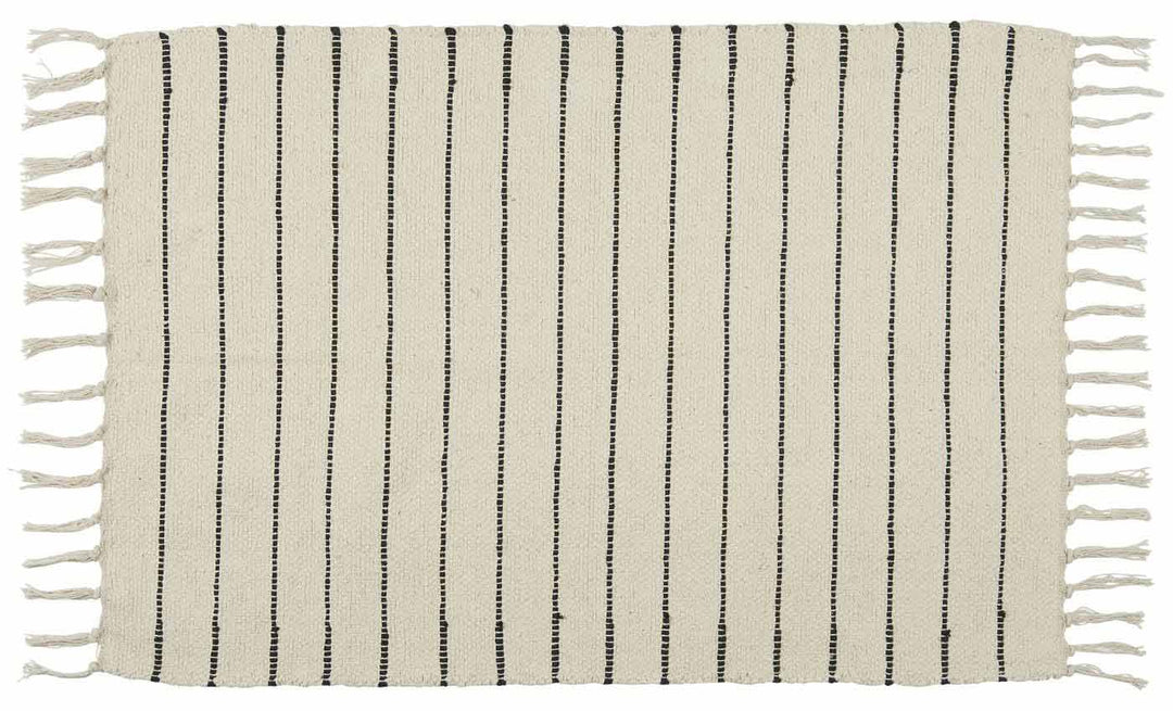 Der Teppich wird aus robuster Baumwolle gefertigt und überzeugt mit seiner weichen Haptik und langlebigen Qualität. Die schwarzen Streifen verleihen ihm einen graphischen Look, während die geknoteten Fransen an den kurzen Seiten für einen Hauch Lässigkeit sorgen. Dank seiner geringen Größe lässt er sich vielseitig kombinieren – ob solo als Eye‑Catcher oder zusammen mit größeren Teppichen für einen angesagten Layering‑Look. Und das Beste: Er lässt sich leicht zusammenrollen und ruckzuck an einen anderen Ort mitnehmen.