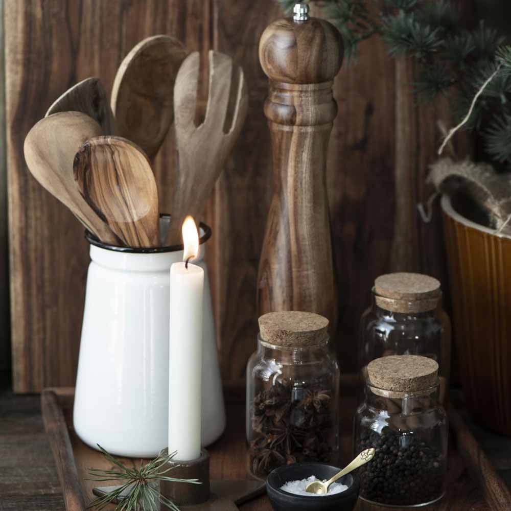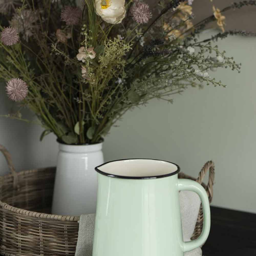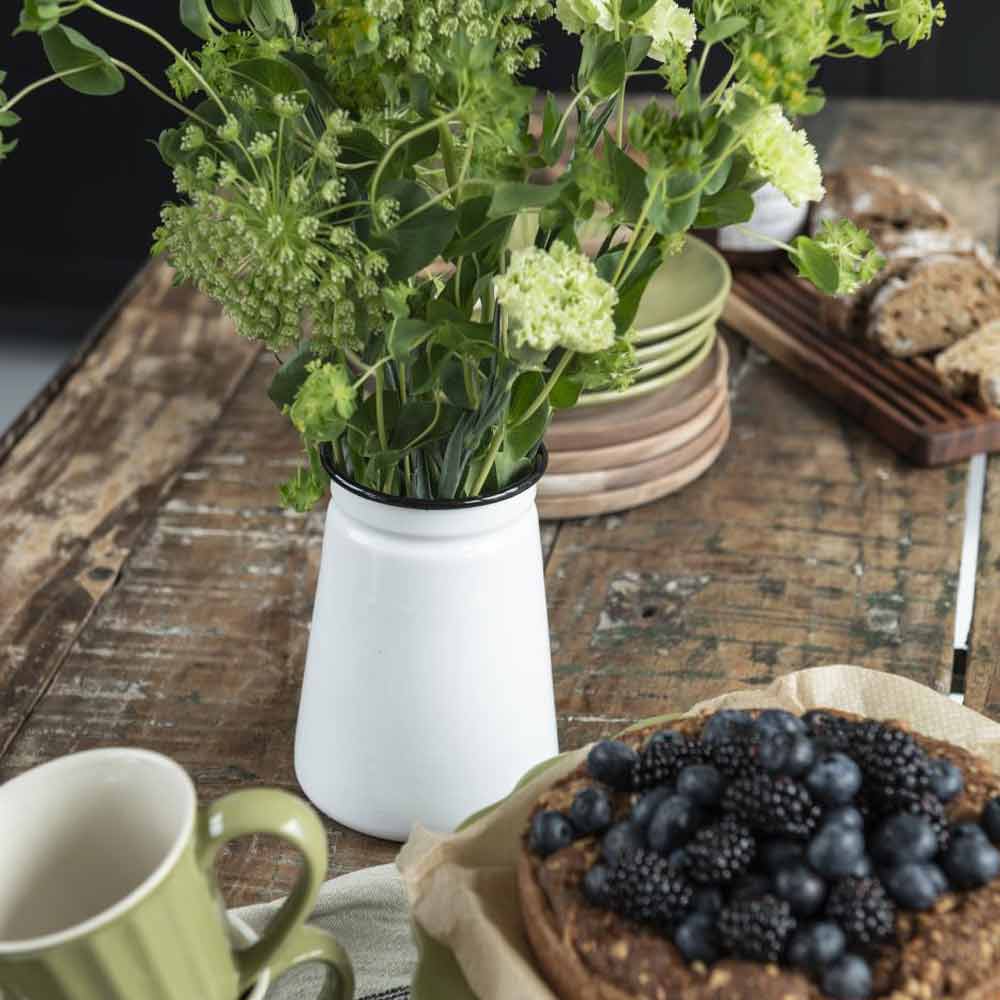 Befülle die Vase Emaille je nach Saison: Im Frühling mit Tulpen, im Sommer mit duftenden Kräutern und im Herbst mit getrockneten Zweigen und Beeren. Stelle sie auf ein rustikales Holztablett zusammen mit Kerzen und Servietten, um einen gemütlichen Mittelpunkt auf dem Tisch zu schaffen. Auch im Badezimmer für Eukalyptus oder neben dem Herd für Holzlöffel macht sie eine wunderbare Figur – schwuppdiwupp hast du mit wenig Aufwand eine stilvolle Ecke gestaltet.