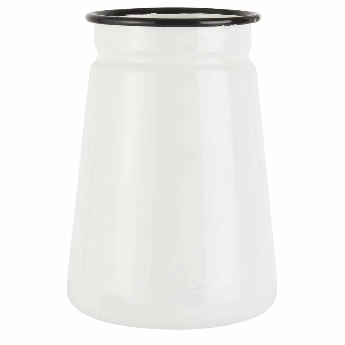 Emaille ist nicht nur robust und pflegeleicht, sondern verleiht der Vase einen glänzenden, glatten Look, der sich sowohl modern als auch vintage anfühlt. Der schwarze Rand bildet einen feinen Akzent und betont die klassische Silhouette. Dank des 11 cm breiten Durchmessers steht die Vase stabil und bietet ausreichend Platz für Wasser und Blumenstiele. Die glatte Oberfläche lässt sich leicht reinigen – ein kurzes Abwischen genügt, um sie wieder strahlend weiß zu machen. Diese Vase vereint Funktionalität mit zeitlosem Design.