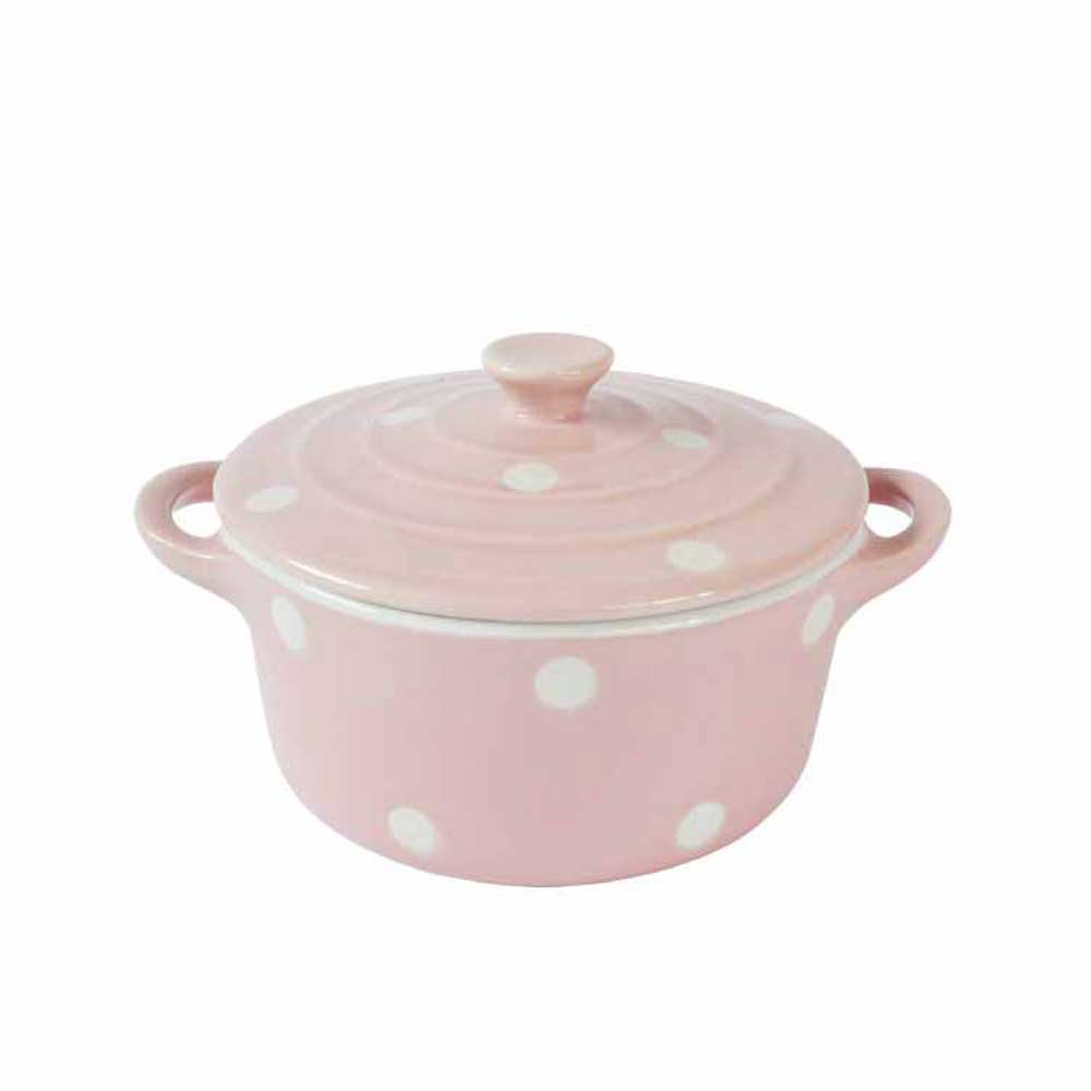 Der kleine Isabelle Rose Topf mit Henkel und Deckel ist ein echter Hingucker für alle, die verspieltes Design und liebevolle Details schätzen. Mit seinem romantischen Polka-Dot-Muster und der zarten Rosa-Färbung bringt er sofort gute Laune in deine Küche – und das im charmanten Landhausstil!