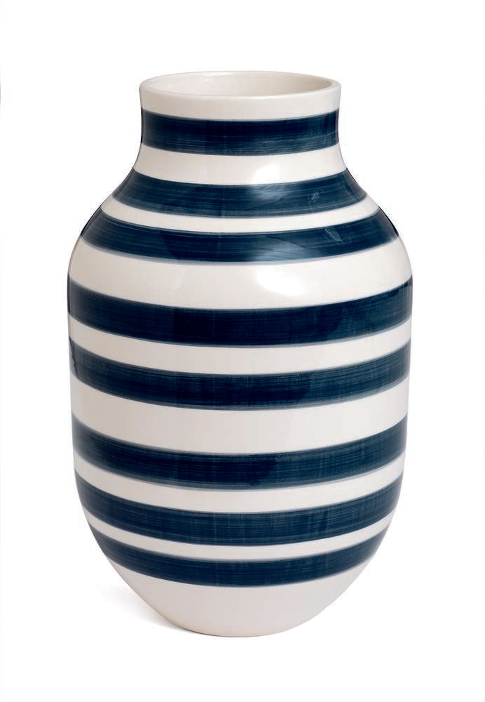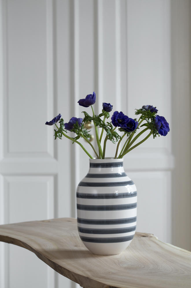 Die formschöne Silhouette und die harmonische Farbgebung machen diese Kähler‑Vase zu einem Prachtexemplar. Jeder Streifen wurde liebevoll per Hand auf die weiße Keramik aufgetragen, sodass jede Vase ein Unikat bleibt. Das zeitlose Omaggio‑Design verbindet Tradition mit modernem Purismus – typisch skandinavisch. Dank der Höhe von 30,5 cm und dem bauchigen Durchmesser von 20 cm bietet die Vase genug Raum für opulente Sträuße, bleibt aber schlank genug, um auch auf dem Sideboard eine gute Figur zu machen.