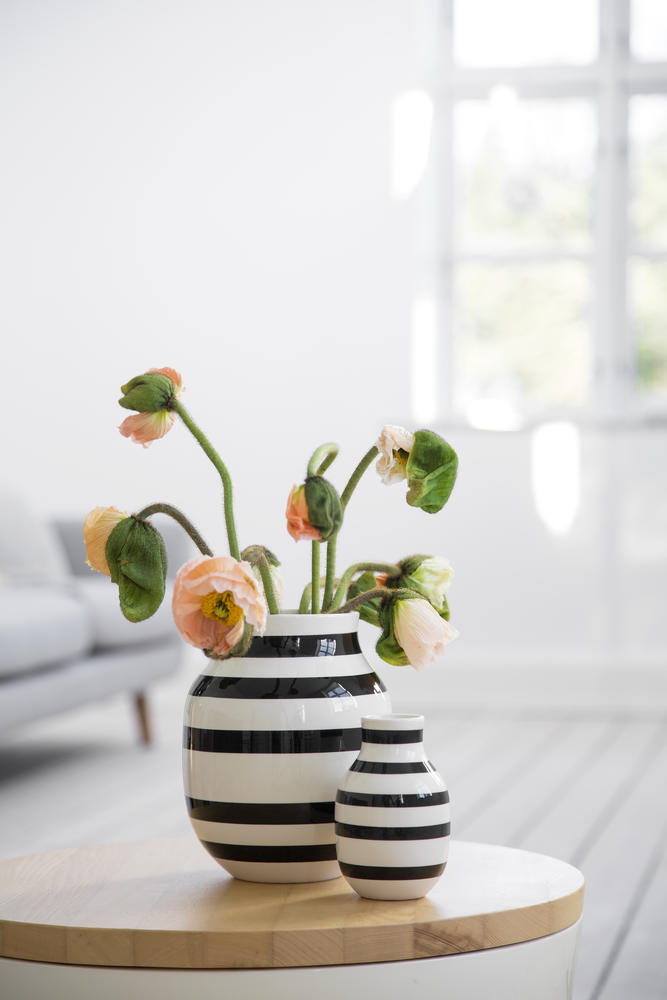 Stelle die Vase gemeinsam mit größeren oder farbigen Omaggio-Vasen auf ein Tablett, um ein abwechslungsreiches Arrangement zu schaffen. Ein kleiner Strauß Wiesenblumen, farbenfrohe Tulpen oder getrocknete Gräser kommen in der schwarz-weißen Optik wunderbar zur Geltung. Durch die runde Silhouette wirkt der Look besonders harmonisch – so zauberst du im Handumdrehen die Kirsche auf der Torte deiner Dekoration.