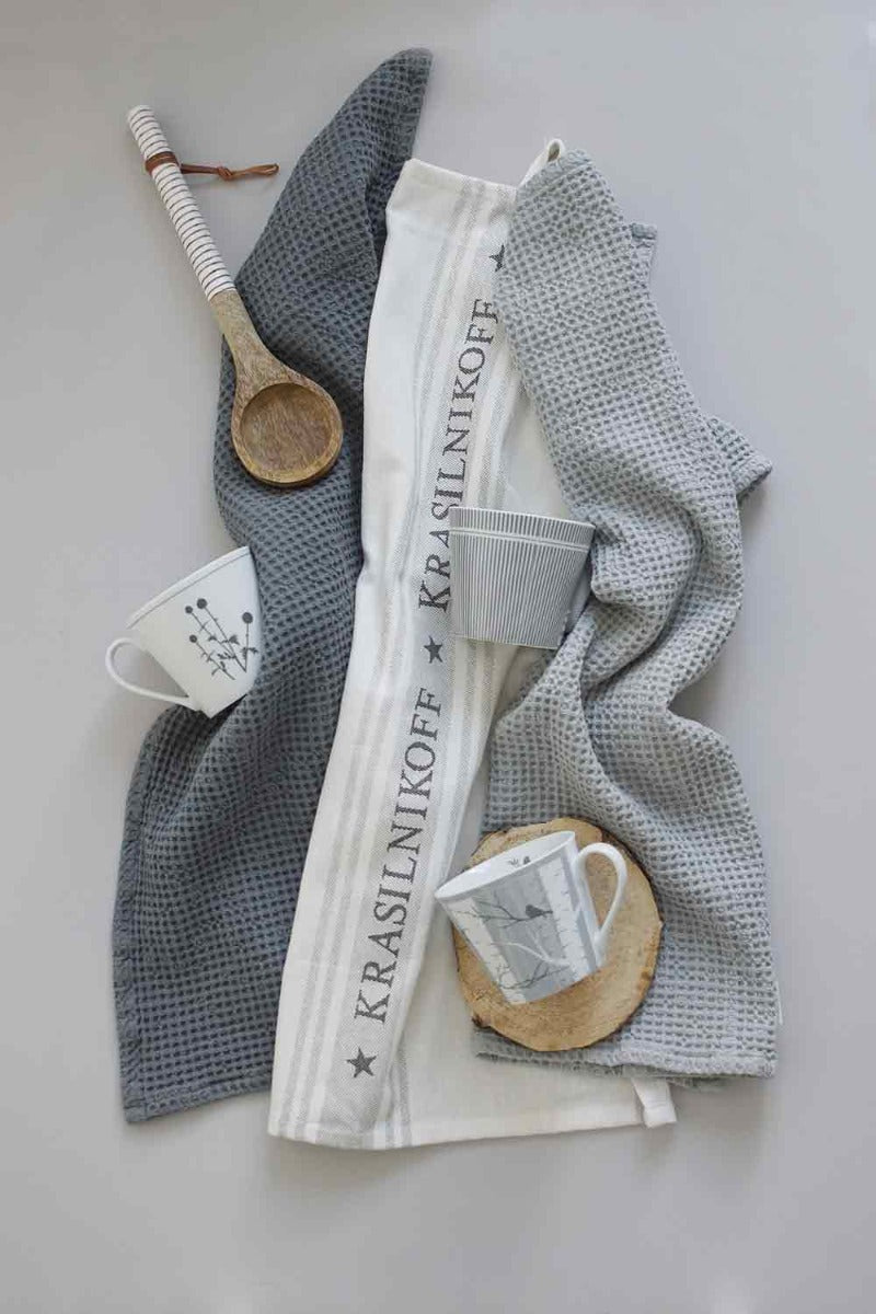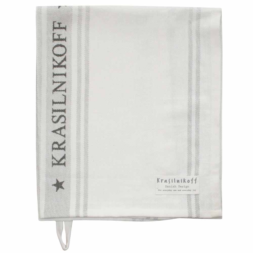 Gefertigt aus hochwertiger Baumwolle ist dieses Geschirrtuch besonders saugfähig und langlebig. Der vertikale Schriftzug „Krasilnikoff“ verleiht dem Tuch eine individuelle Note, während die eingearbeitete Aufhängeschlaufe für praktische Ordnung sorgt. Mit einer Länge von 70 cm und einer Breite von 50 cm bietet es viel Fläche zum Abtrocknen【624219031578575†screenshot】. Die zeitlose Farbkombination passt zu jeder Kücheneinrichtung – egal ob modern, Landhaus oder Skandi-Stil.