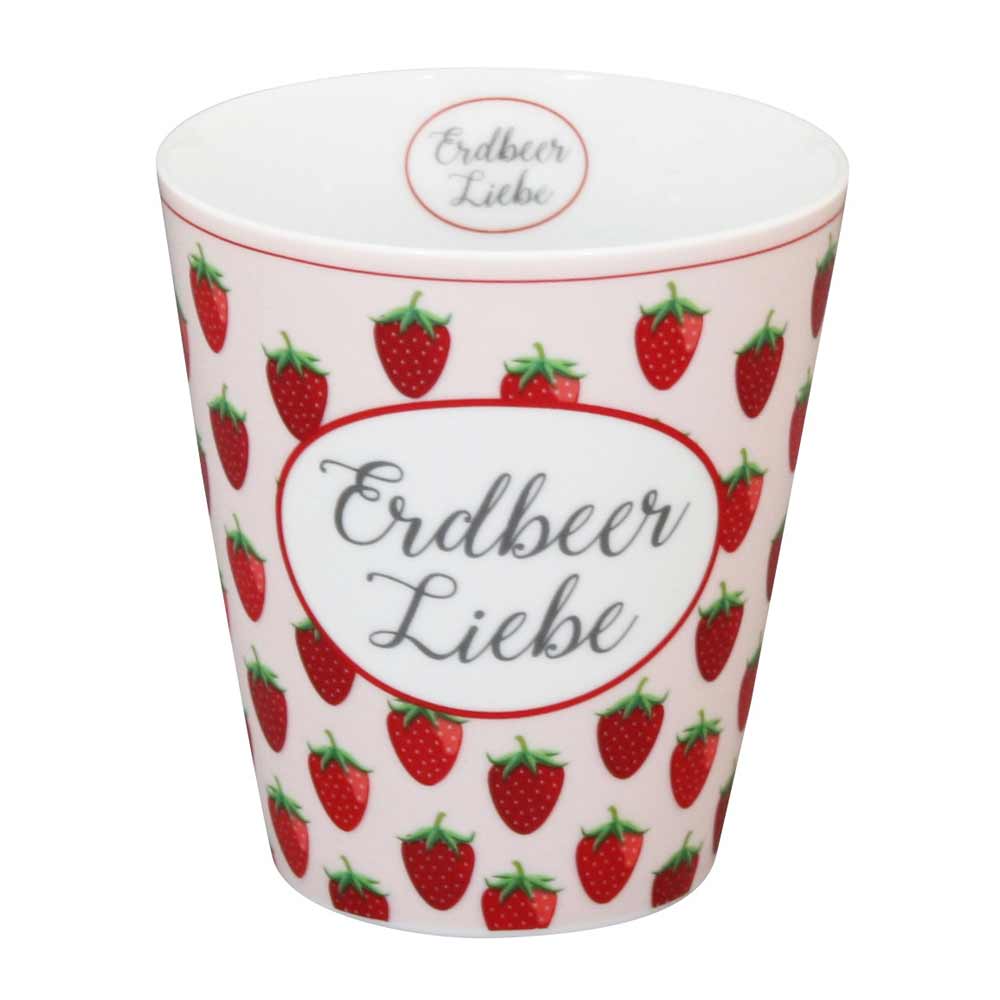 Die Tasse besticht durch ihr verspieltes Design mit roten Erdbeeren und grünen Blättern auf weißem Hintergrund. Der Schriftzug "Erdbeer Liebe" in geschwungener Schrift verleiht ihr eine besondere Note. Hergestellt aus hochwertiger Keramik, ist sie robust und langlebig, ideal für den täglichen Gebrauch.