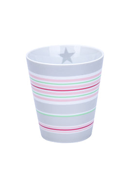 Die Kombination aus neutralem Grau und zarten Farbstreifen verleiht dem Mug einen modernen Look. Die konische Form schmiegt sich an die Hände, und der sternförmige Akzent im Inneren sorgt für ein kleines Extra.