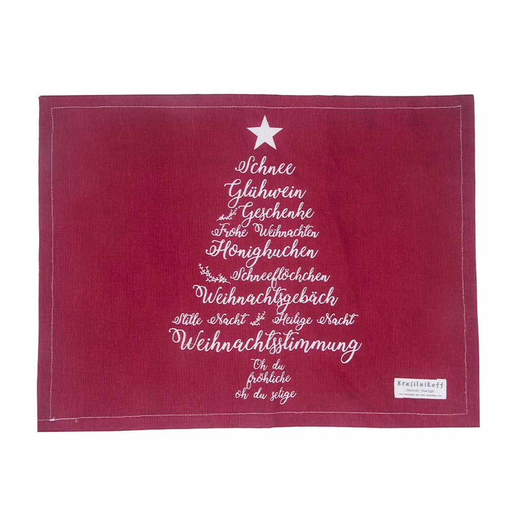 Das Krasilnikoff-Tischset „Christmas Words“ bringt weihnachtliche Stimmung direkt auf deinen Tisch. Das festliche Rot und der kreative Schriftzug, der in Form eines Weihnachtsbaumes arrangiert ist, machen jedes Dinner zum Hingucker – ideal für gemütliche Weihnachtsabende mit der Familie.