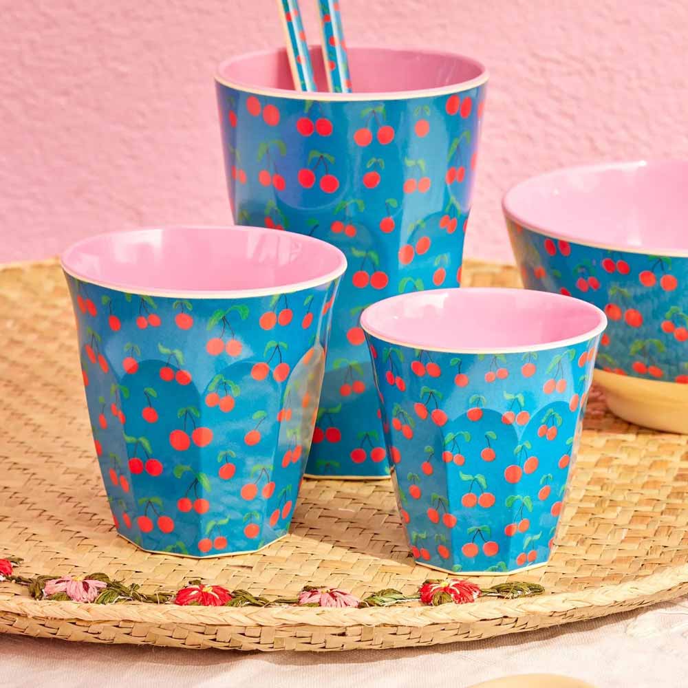 Der Melamin-Becher „Cherry Love“ von Rice bringt fruchtige Fröhlichkeit auf Deinen Tisch! Mit seinem verspielten Kirschmotiv auf kräftigem Blau und dem zarten Rosa im Inneren sorgt er sofort für gute Laune – perfekt für kleine und große Hände beim Frühstück, Picknick oder der Gartenparty. Dank des robusten Materials ist er der ideale Alltagsbegleiter für Familien.