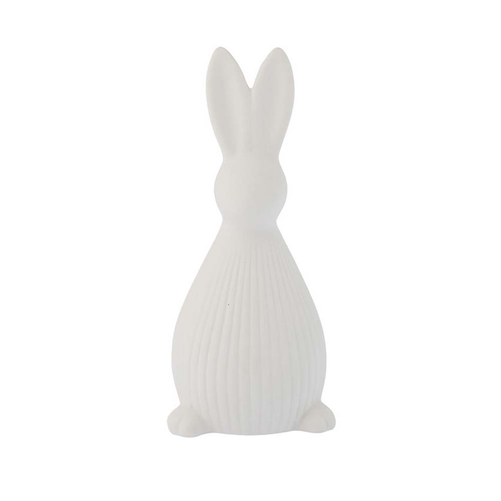 Die matte, weiße Keramik verleiht dem Hasen eine edle Ausstrahlung, während die geriffelte Struktur am unteren Bereich subtile Details hinzufügt. Die abstrakte Form mit langen Ohren und kugelförmigem Kopf macht ihn zu einem besonderen Blickfang in deinem Zuhause.