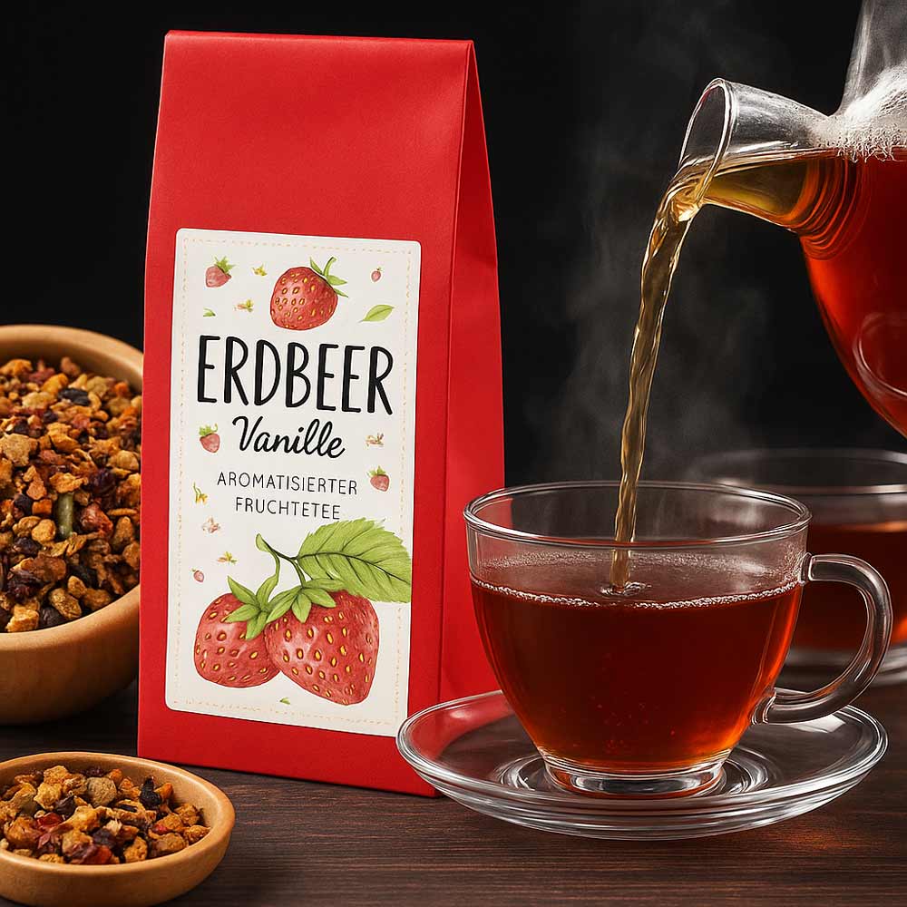 Erdbeere & Vanille 8–12 Minuten 1 TL pro 200 ml Rote Tüte mit handgezeichnetem Etikett